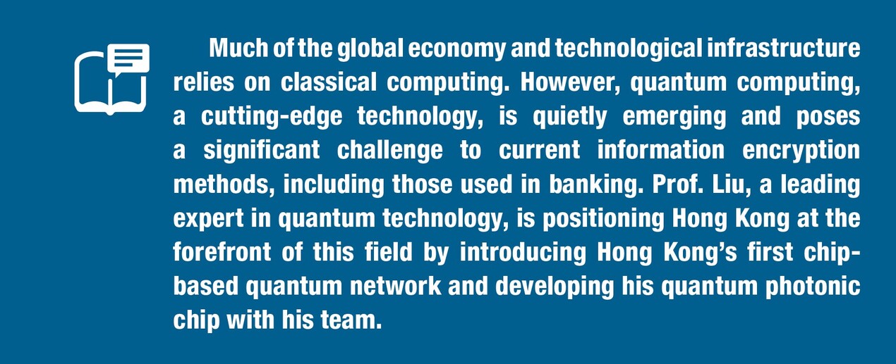 For years, QKD has worked mainly in controlled labs. Now, it is stepping into the real world. Making the technology compact and chip-based is key to bringing it into our city networks. Prof. Ai-Qun LIU, Chair Professor of Quantum Engineering and Science of the Department of Electrical and Electronic Engineering at The Hong Kong Polytechnic University and Hong Kong Global STEM Professor, and his research team have completed Hong Kong’s first urban quantum network test—a major milestone in the shift from lab research to commercialisation [1]. It is one of the earliest demonstrations of a chip-based QKD system operating reliably over actual city fibre lines, pointing the way to affordable, large-scale quantum-safe communication.