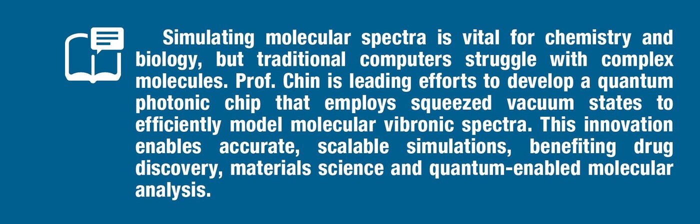 In recent research published in Nature Communications [1], Prof. Lip Ket CHIN, Associate Professor of the Department of Electrical and Electronic Engineering at The Hong Kong Polytechnic University, and the research team led by Prof. Ai-Qun LIU from the same department address these challenges by introducing a novel algorithm and an integrated quantum photonic microprocessor chip capable of simulating molecular vibronic spectra with unprecedented scalability and fidelity.