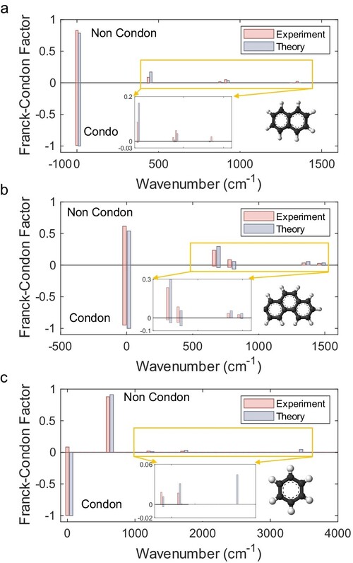 Beyond the Condon approximation, the chip was employed to simulate non-Condon effects, where the transition dipole moment varies with nuclear coordinates, in naphthalene (C10H8), phenanthrene (C14H10) and benzene (C6H6) (Figure 4). Using the first-order Herzberg-Teller expansion, the experimental spectra for these molecules achieved fidelities of 98.4%, 98.4% and 93.4% respectively, closely matching theoretical predictions and capturing subtle spectral features arising from non-Condon effects. These results highlight the chip’s capability to simulate complex molecular processes beyond the reach of classical computation and previous quantum experiments, which were limited to virtual or two-mode molecules.