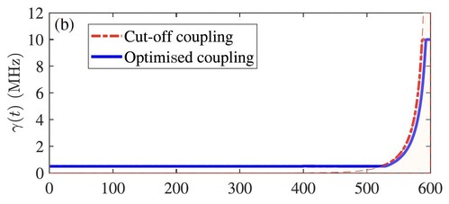 The paradigm shifts when a tunable—but limited—coupler is introduced. For challenging shapes like the exponentially rising photon, an ideal coupler would require infinite strength, which is impossible. A realistic cutoff scheme performs poorly (Figure 2a). However, when an optimised u(t) is added alongside this limited γ(t), performance improves dramatically (error drops from 0.112 to 0.038). Joint optimisation of both controls yields the best result (Figure 2a, error 0.028). The coherent control actively compensates in the time regions where the coupler's tunability fails (Figure 2c).