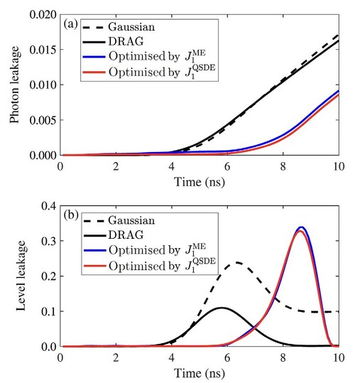 The optimised controls designed were shown to outperform standard Gaussian and DRAG pulses significantly (Figure 3). They successfully suppress both level leakage (population in states |2〉, |3〉, etc.) and photon leakage (unwanted early emission), achieving fidelities of over 99.4% (Figure 4). This demonstrates QOCT's effectiveness in managing the specific imperfections of real-life hardware.
