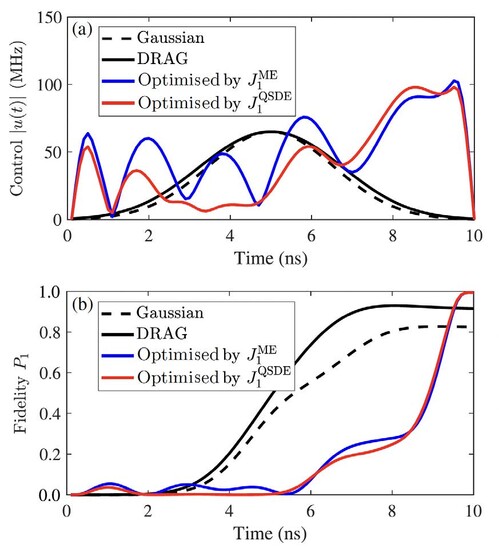 Figure 3. (a) Amplitude of the Gaussian π-pulse, the DRAG pulse and the optimised control pulses subject to objective functionals.