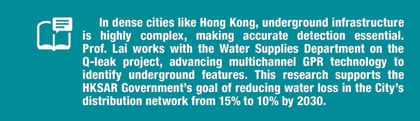 The impact of this research extends beyond positioning enhancement. In collaboration with the Water Supplies Department, Prof. Lai's team launched the Q-Leak training centre, a pioneering initiative aimed at advancing underground water mains leak detection. The Q-Leak project also supported research into new GPR-based methods for characterising water leakage, such as the use of instantaneous frequency slices to enrich detection capabilities [2]. The team is now exploring AI and robotic solutions to collect sound data directly from within pipelines, further improving localisation and enabling immediate repair.