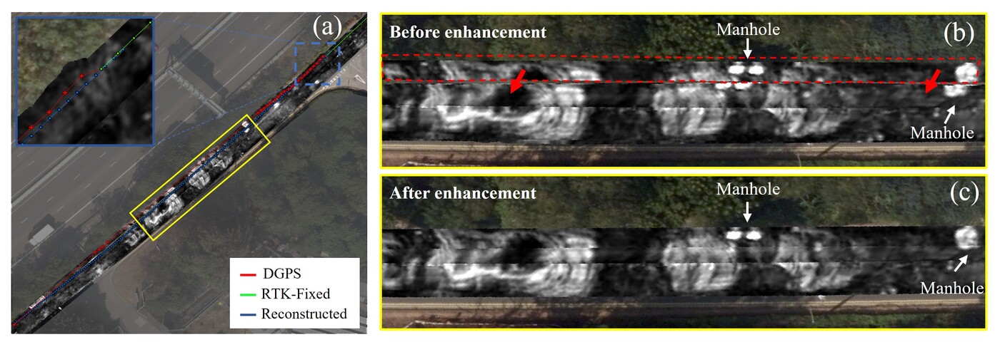In one urban survey, GNSS signals degraded near tree canopies, causing significant drift and long-distance positioning loss. The proposed method was able to reconstruct the affected trajectories using only the MCGPR data, restoring alignment of high-reflection features such as manholes and dramatically improving the coherence of radar slices (Figure 3). Visual comparisons revealed that objects previously mismatched due to drift were now accurately positioned, validating the method’s ability to overcome the limitations of external positioning systems in complex environments.