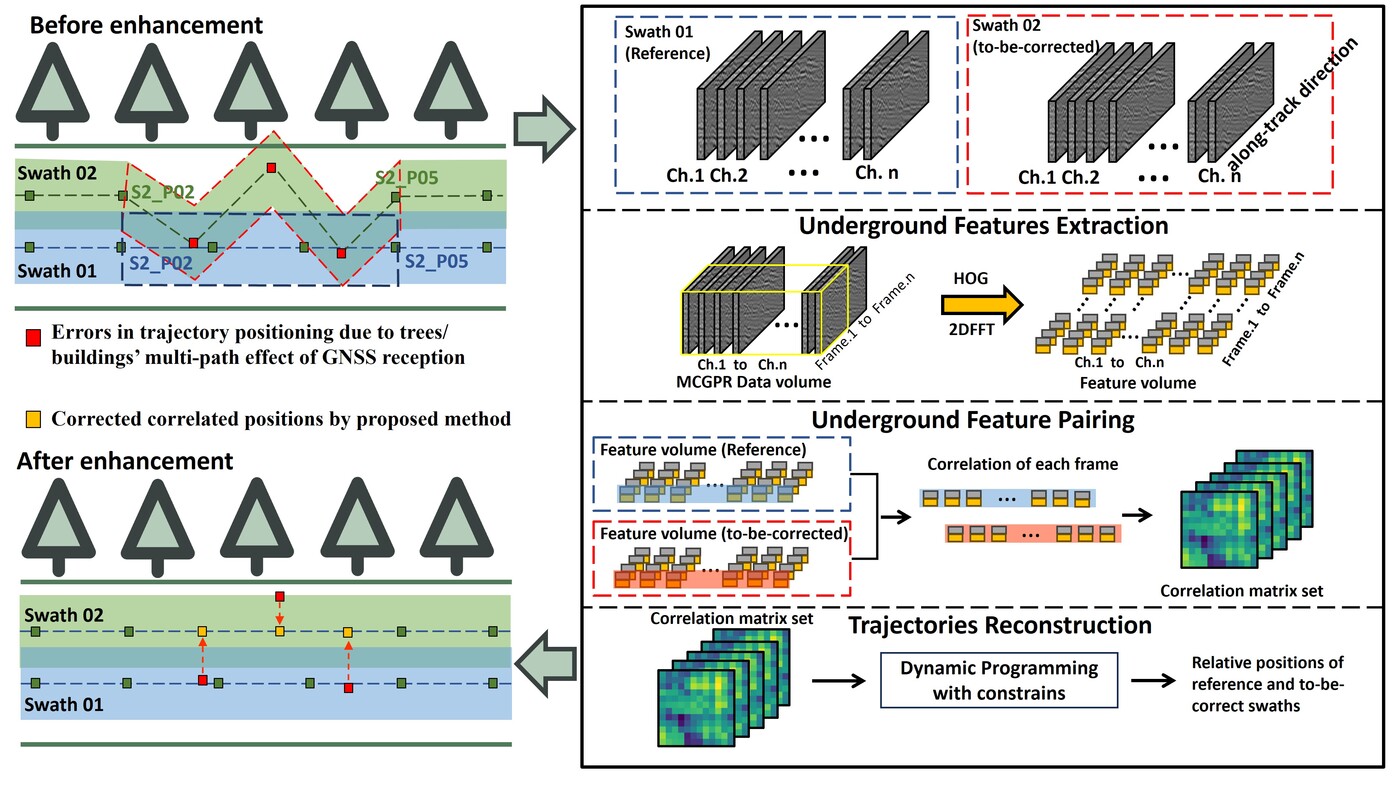 At the core of their breakthrough is a three-stage framework that fundamentally reconsiders how MCGPR data can be used to refine positioning accuracy. Traditionally, the reliability of GPR surveys have hinged on external positioning systems such as GNSS-RTK, which often falter amid tall buildings and dense foliage, Hong Kong’s typical cityscape. The proposed method turns the MCGPR system into a supplementary sensor, extracting underground features as reference points to reconstruct survey trajectories with unprecedented precision.