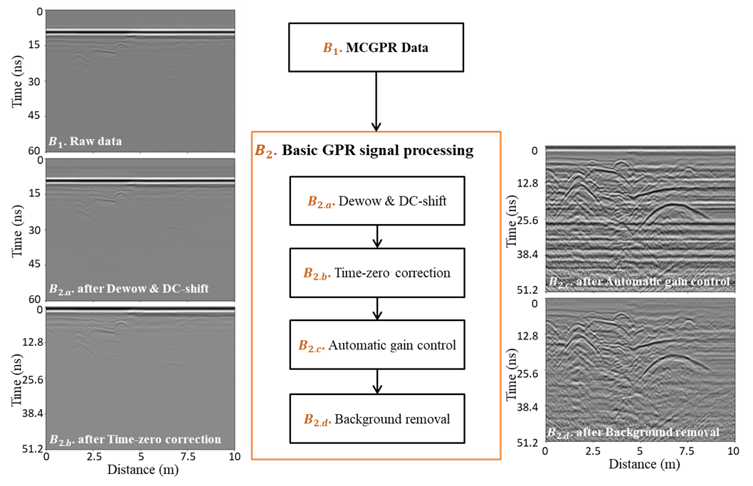 Figure 1. Workflow of basic GPR signal processing for mitigating noise and enhancing the visibility of underground features