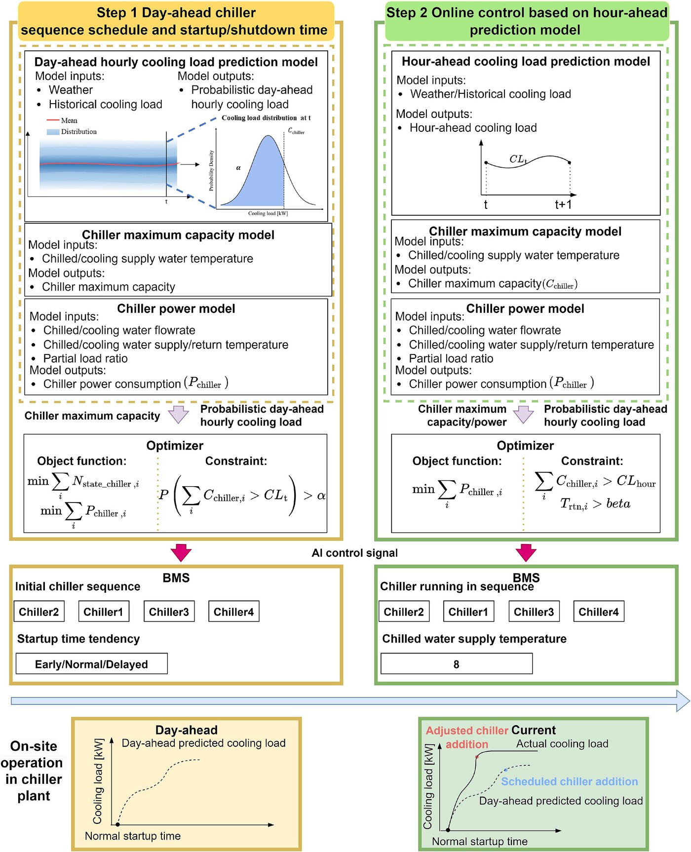 Unlike traditional systems that might only rely on single-horizon predictions or fixed control rules, this AI solution uses a hierarchical approach (Figure 1). Day-ahead forecasts, based on predicted weather, occupancy and historical data, determine the chiller sequence and the morning start-up time for the entire plant. Hour-ahead predictions, combining real-time data with updated weather forecasts, fine-tune the start and stop times of each chiller and adjust chilled water temperatures. This dual-horizon method ensures that both long-term trends and short-term fluctuations are captured, ensuring more stable and efficient system performance.