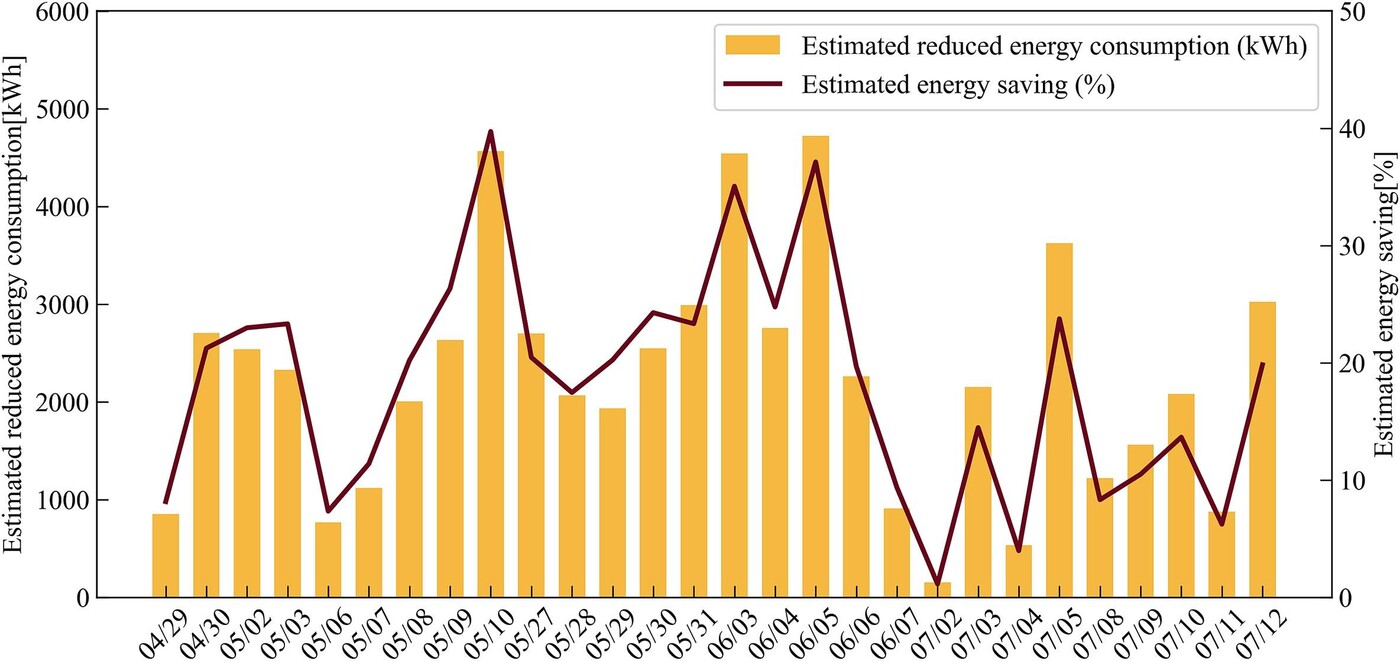 The performance of the AI-enabled control strategy was rigorously validated through a six-week on-site test during the transition season and early summer (Figure 3). Achieving an average energy saving of 18.4%, the system outperformed conventional rule-based controls, with daily savings ranging from 1.1% to nearly 40%. On a typical test day, the power consumption of the chillers was reduced by up to 21%, and the coefficient of performance (COP) of the chiller plant increased by as much as 47%. These improvements were achieved without compromising thermal comfort, as the system dynamically adjusted to meet real-time cooling demands.
