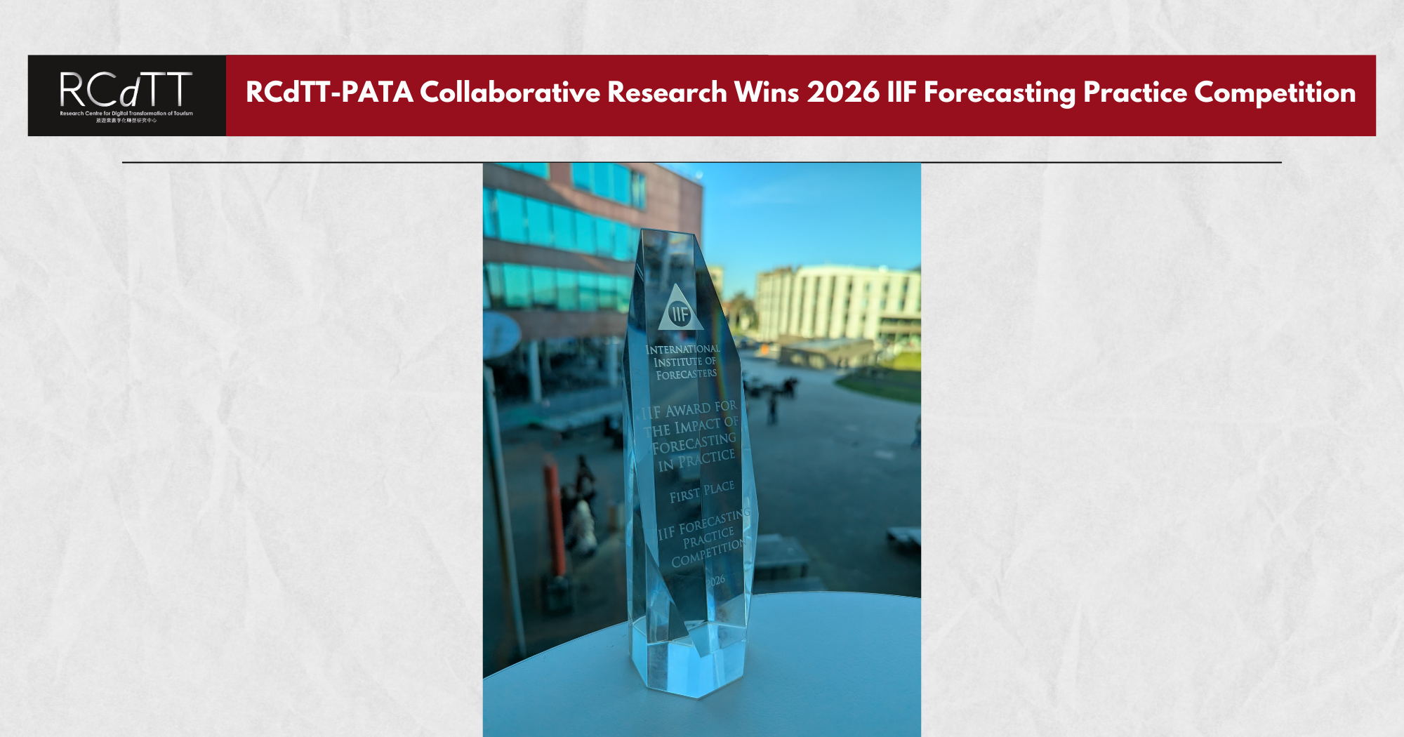 Prof. Richard Qiu received the prize on behalf of the project team in Brugge, Belgium on 1 March 2026. The Research Centre for Digital Transformation of Tourism (RCdTT) and the School of Hotel and Tourism Management (SHTM) at The Hong Kong Polytechnic University, in long-standing partnership with the Pacific Asia Travel Association (PATA), has won the 2026 International Institute of Forecasters (IIF) Forecasting Practice Competition, as well as the IIF Award for the Impact of Forecasting in Practice and a US$10,000 prize.