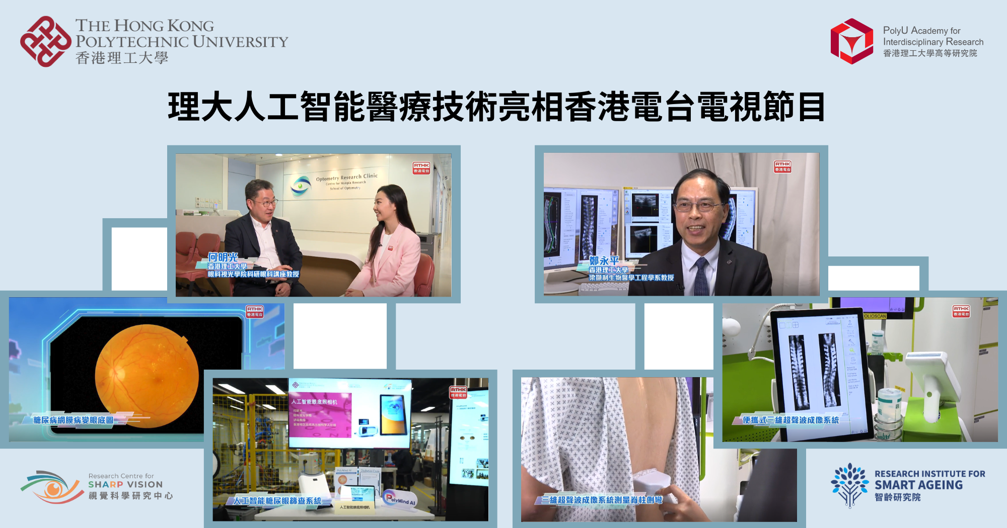 香港理工大學視覺科學研究中心主任、眼科視光學院科研眼科講座教授兼梁顯利長者健康視覺教授何明光教授,以及智齡研究院院長、生物醫學工程學系講座教授兼梁顯利生物醫學工程教授鄭永平教授,於香港電台電視節目《凝聚香港》介紹了理大兩項結合人工智能和醫療科技的創新發明,其中包括用於篩查糖尿病視網膜病變的便攜式人工智能相機,以及便攜式無輻射三維超聲脊柱側彎評估系統「Scolioscan」。 網上報導: 香港電台 - https://polyu.me/3QrsOB7(04:09 - 08:52)