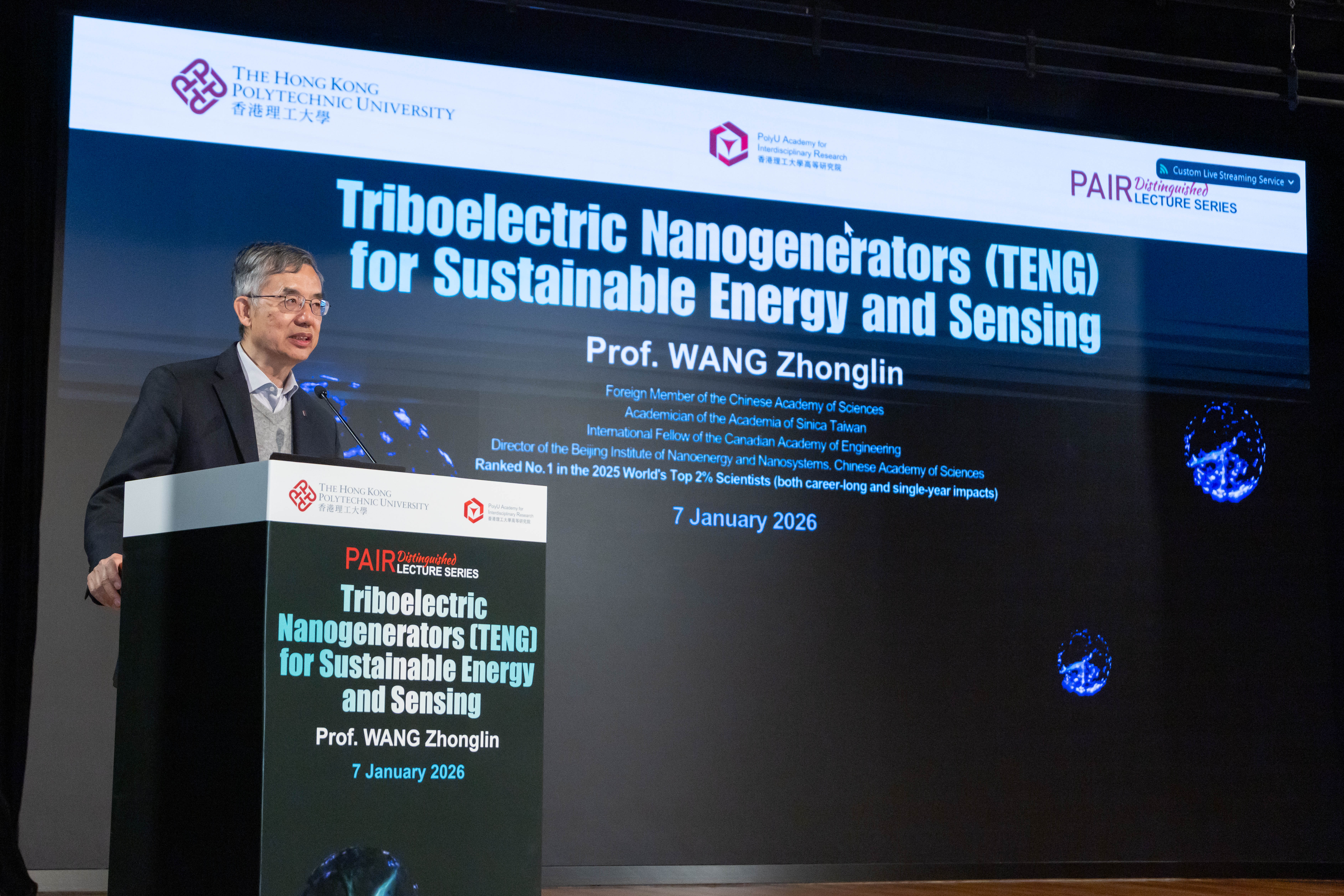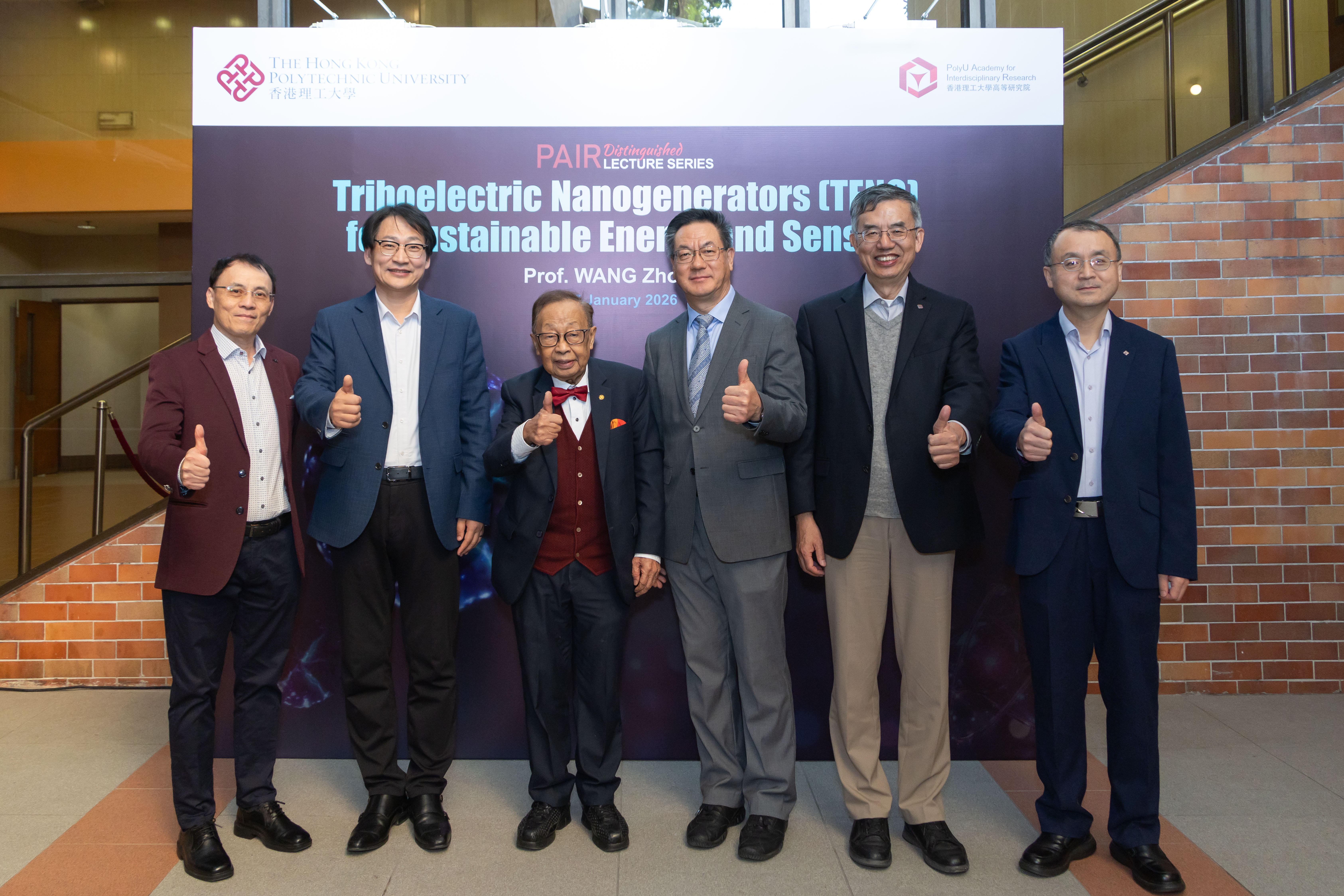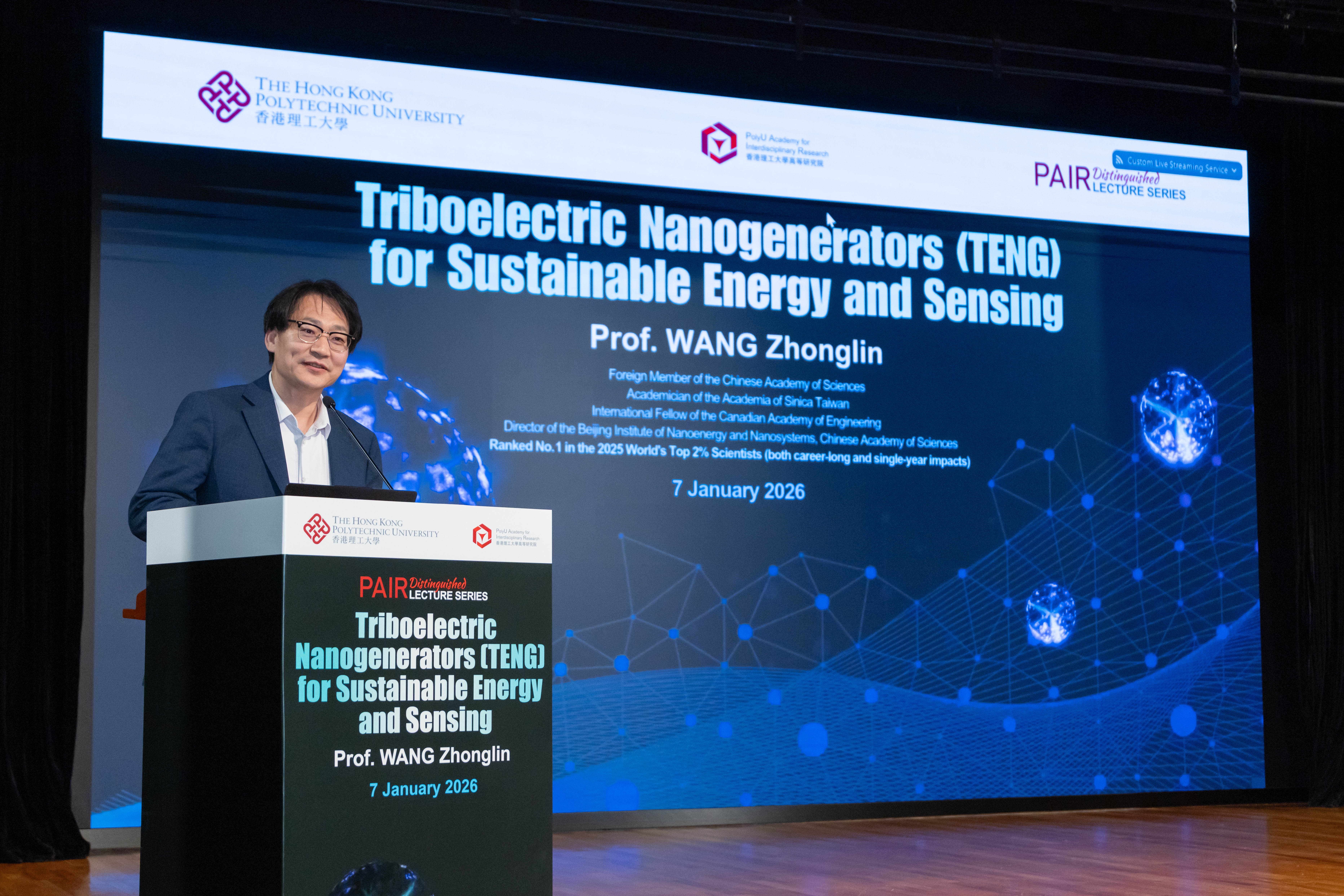 2026年1月7日,中國科學院北京納米能源與系統研究所所長王中林教授在香港理工大學校園演講高等研究院傑出學人講座,題為「用於永續能源與感測的摩擦納米發電機」。講座於蔣震劇院舉行,現場座無虛席,吸引逾240名觀眾參與,並透過各大社交媒體平台吸引超過16,600名線上觀眾。
