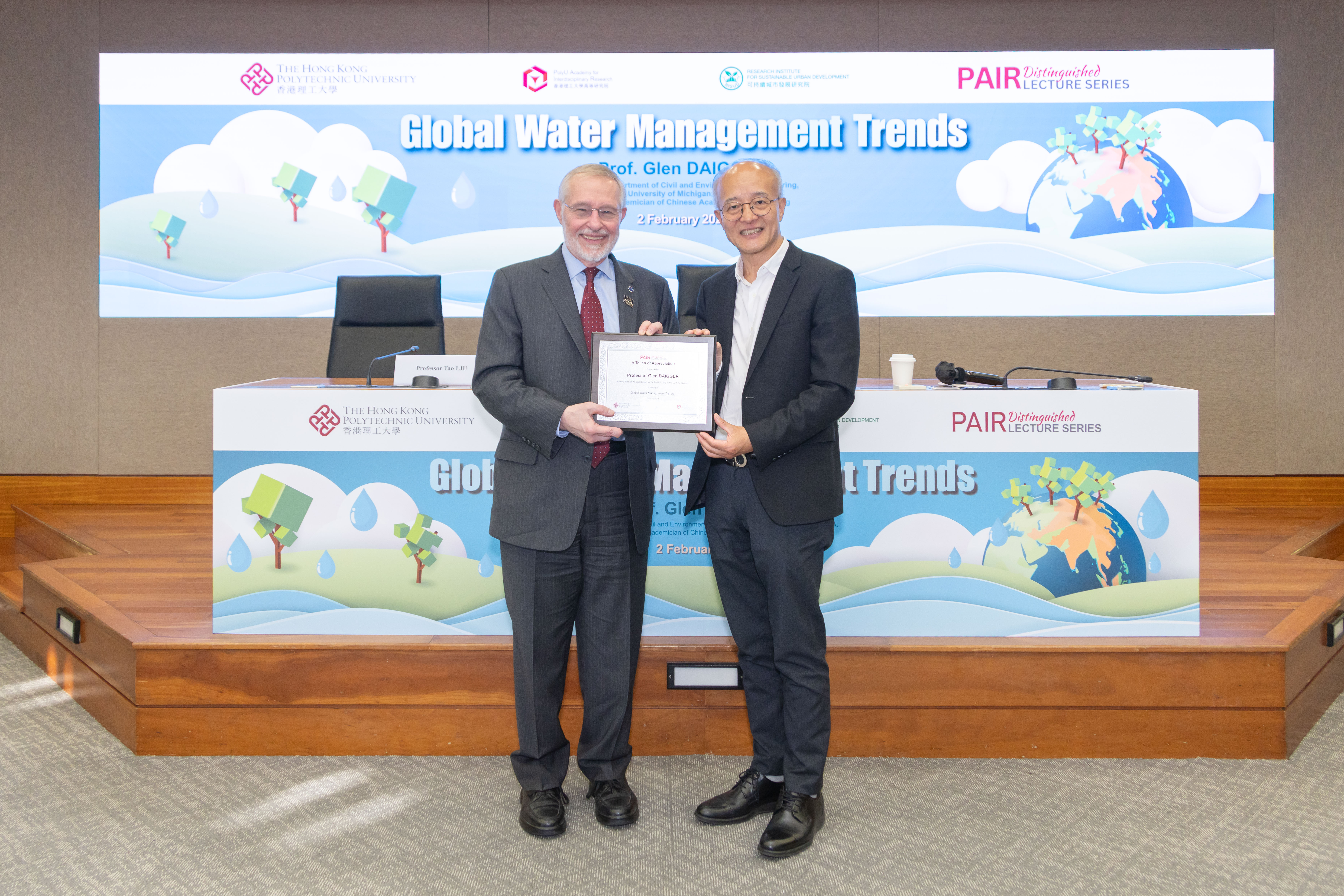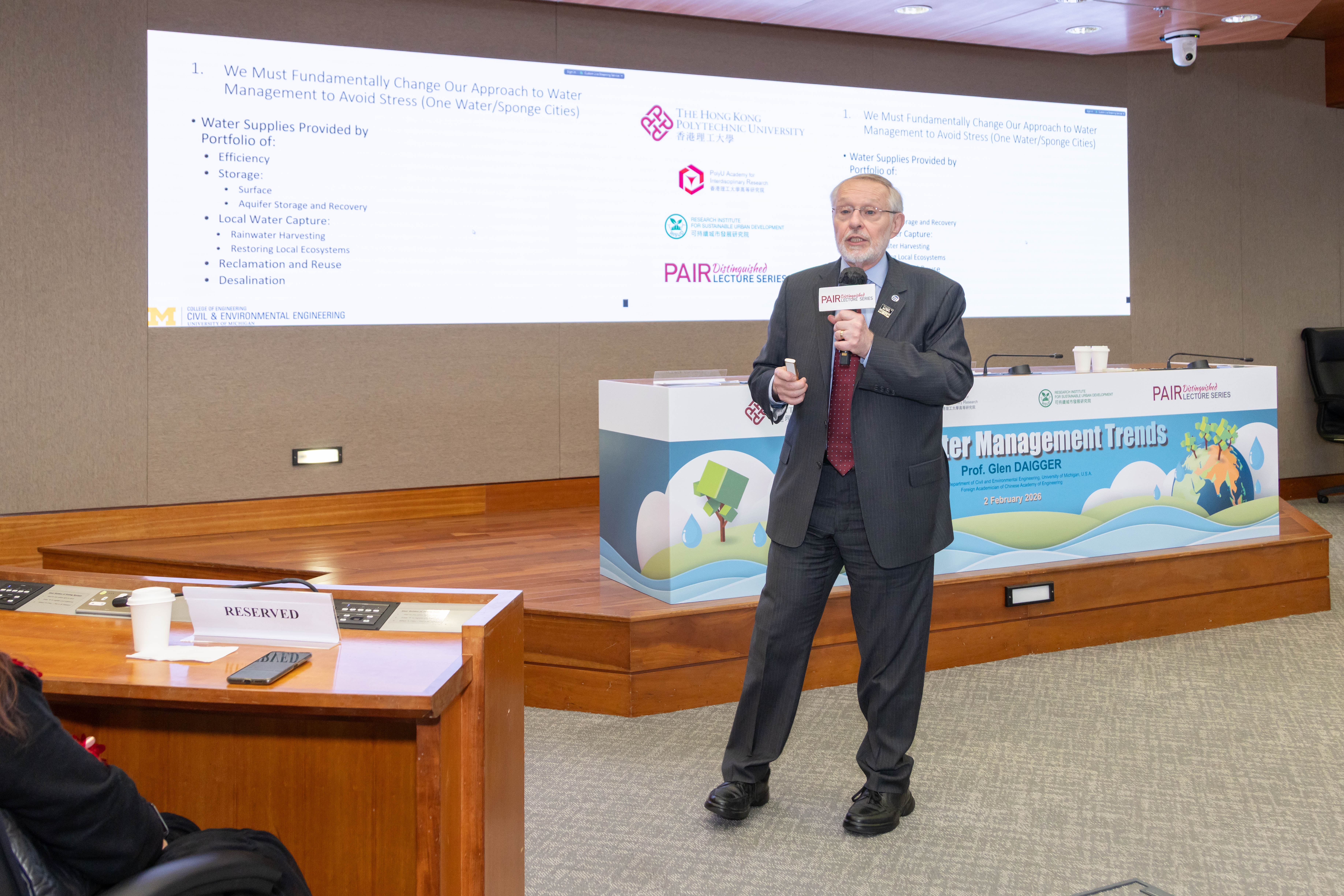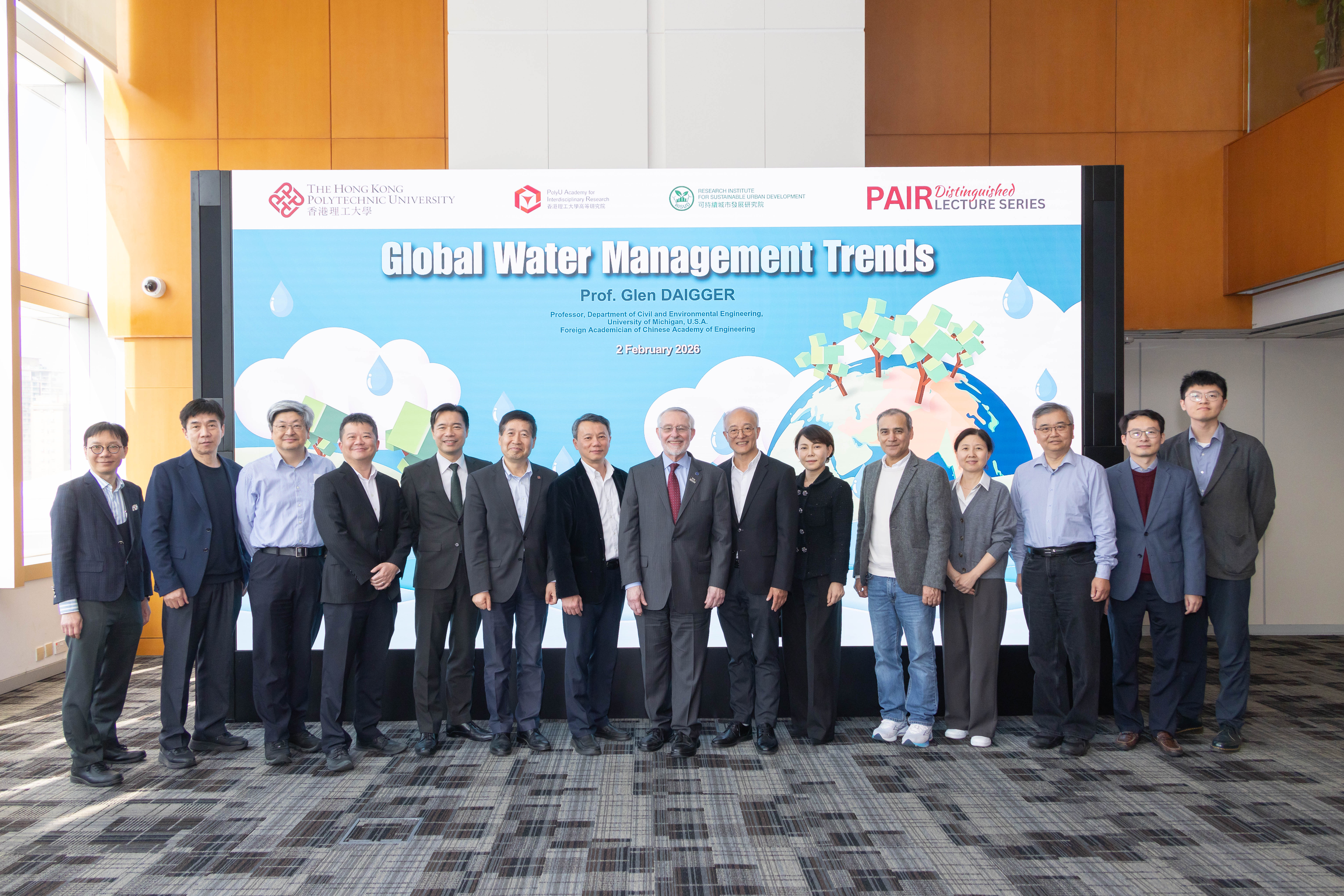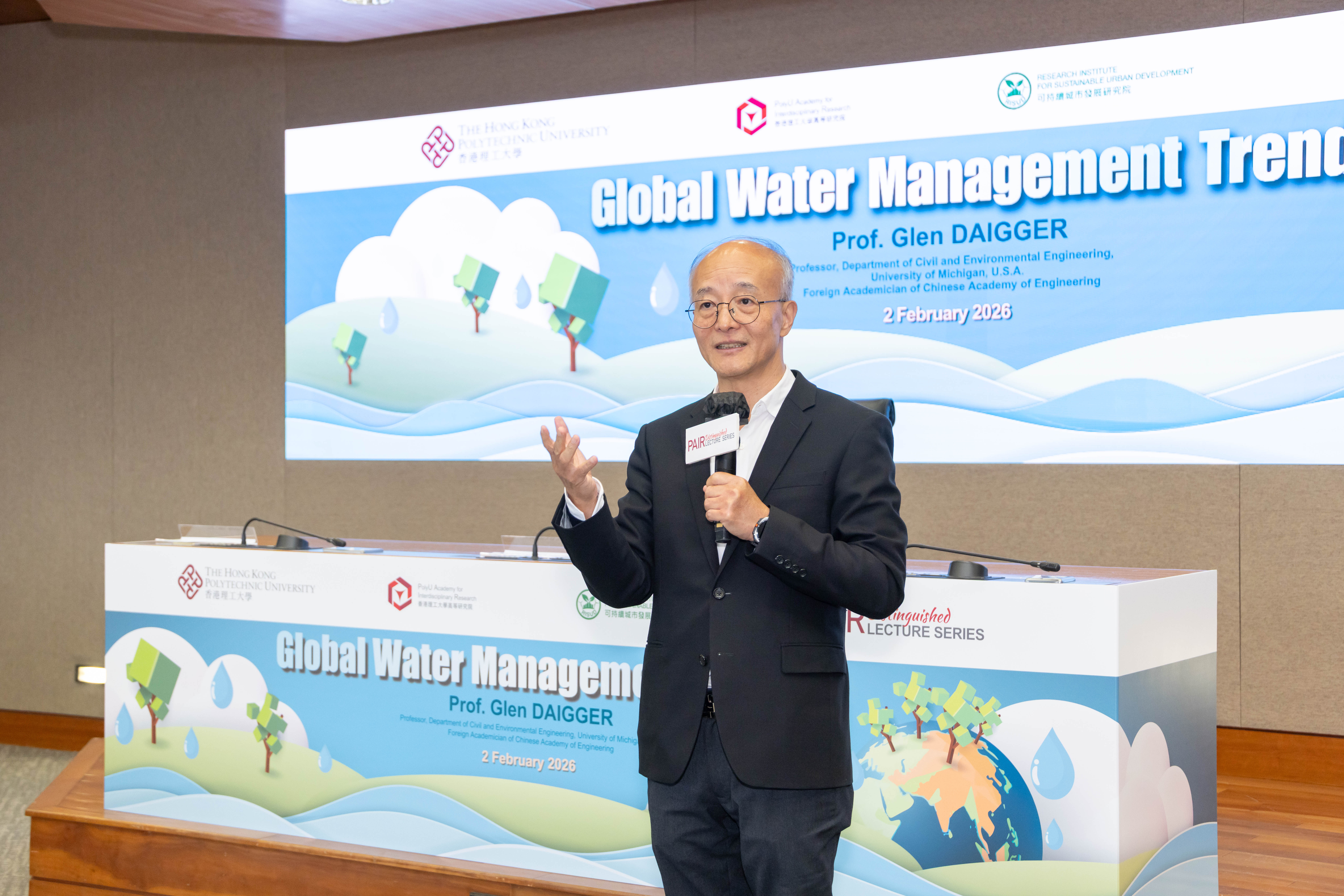 2026年2月2日,來自美國密歇根大學的Glen DAIGGER教授應邀蒞臨理大校園,主講以「全球水資源管理趨勢」為題的理大高等研究院傑出學人講座。活動吸引逾110名現場觀眾參與,及超過16,900名網上觀眾透過各大社交媒體平台同步收看,反響熱烈。