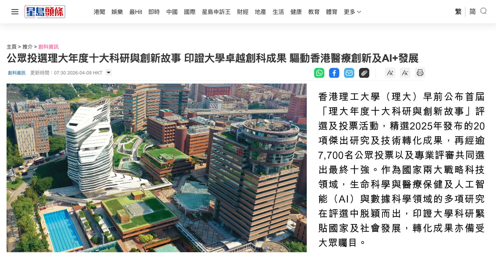 The award‑winning stories span five strategic research areas identified by PolyU, including AI and data science, life sciences and healthcare, environment and sustainability, materials science, and smart cities, injecting strong innovation momentum into Hong Kong’s high‑quality development.