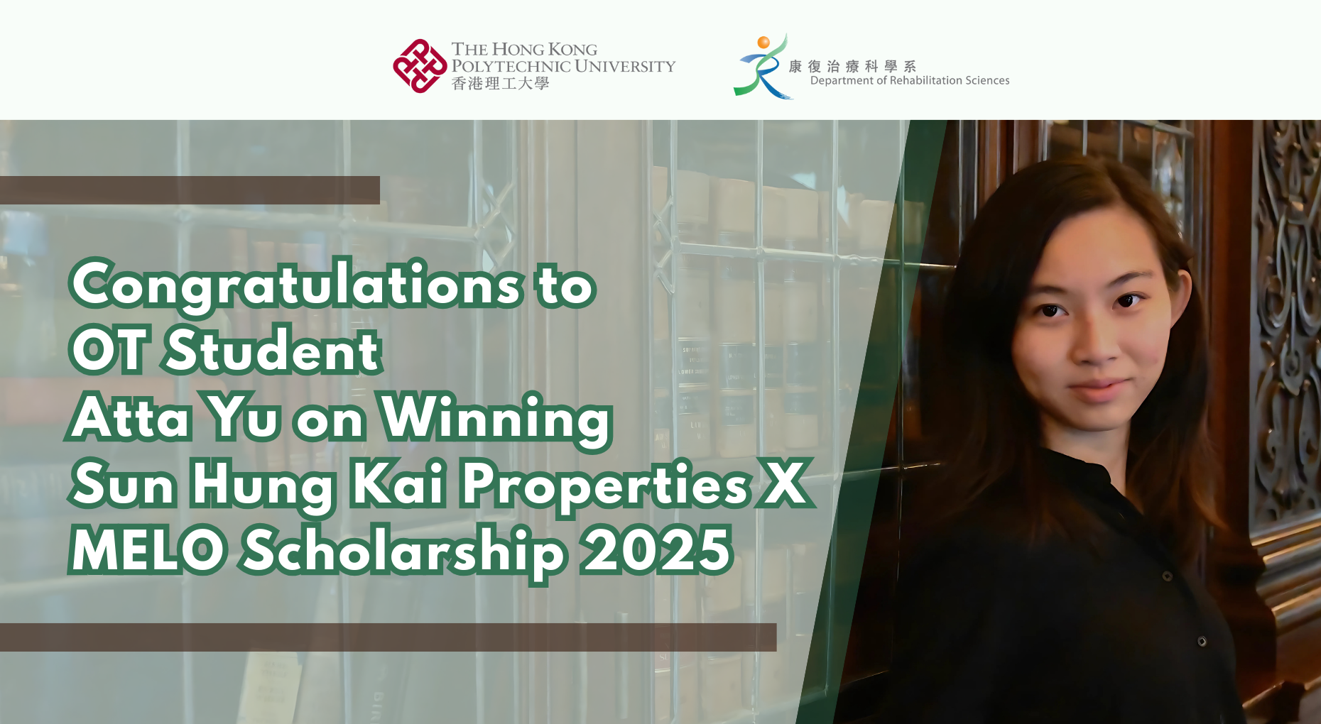 Atta Yu, our Year 3 Occupational Therapy student, has been awarded the Sun Hung Kai Properties X MELO Scholarship 2025. The organisers remarked that Atta demonstrated an exceptional commitment to advancing the field of psychiatric and mental health, securing her position as one of only two awardees. This scholarship recognises qualities that are closely aligned with our department’s core values: Please join us in extending our heartfelt congratulations to Atta for this well-deserved recognition. Her success reflects not only her dedication and talent but also inspires all of us within the department.