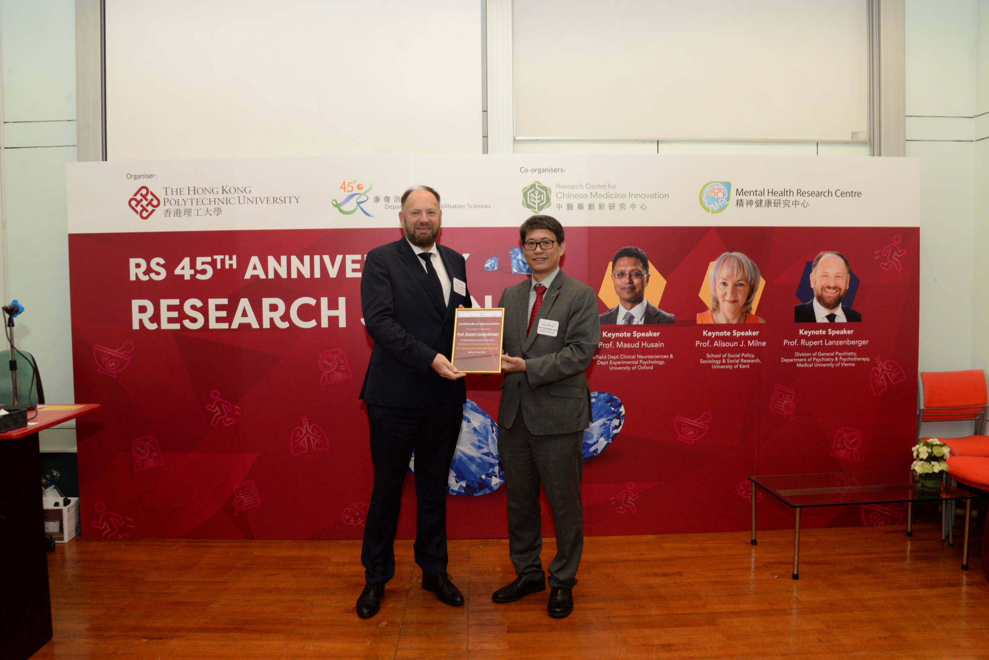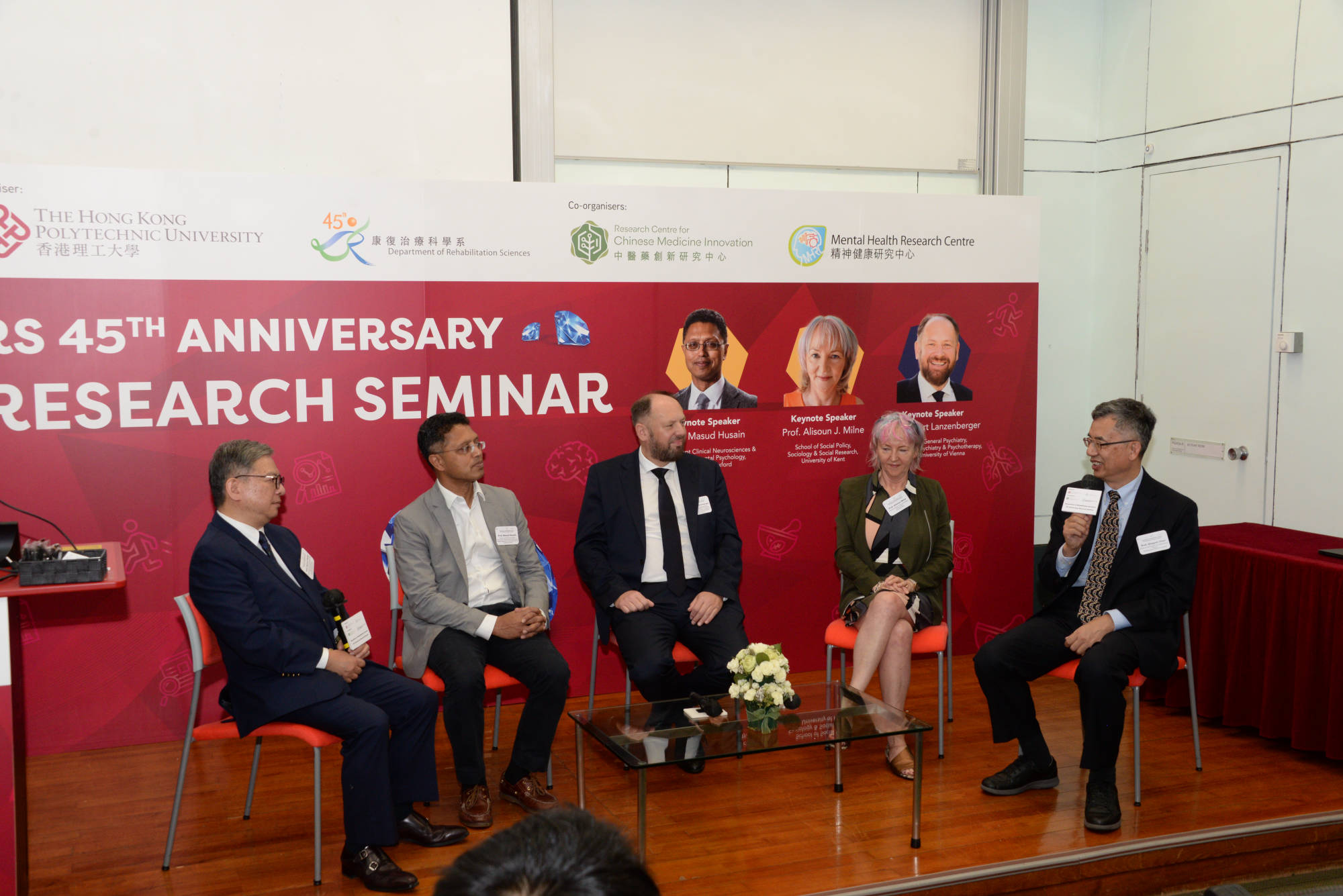 Three distinguished keynote speakers had been invited to deliver lectures, they are Prof. Masud Husain (Professor of Neurology & Cognitive Neuroscience, Wellcome Trust Principal Fellow, Nuffield Department of Clinical Neurosciences, University of Oxford), Prof. Alisoun J. Milne (Professor Emeritus of Social Gerontology and Social Work, University of Kent) and Prof. Rupert Lanzenberger (Professor in Clinical Neurosciences Section Head: NEUROIMAGING LABS (NIL) Division of General Psychiatry, Department of Psychiatry and Psychotherapy, Medical University of Vienna). The seminar was also graced by esteemed guests including Dr Cissy Choi (Assistant Commissioner for Primary Healthcare 1, Primary Healthcare Office Health Bureau), Prof. Christopher Chao (Vice President – Research and Innovation, PolyU) and Prof. Qingyan Chen (Director of PolyU Academy for Interdisciplinary Research, PolyU) .