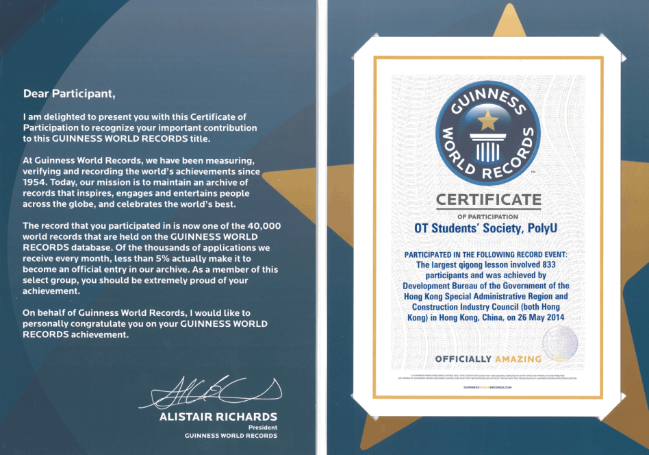 New Guinness World Record for the ‘Largest Qigong Lesson’ was made by RS students of the BSc (Hons) in OT programme in the Construction Safety Week in 2014.