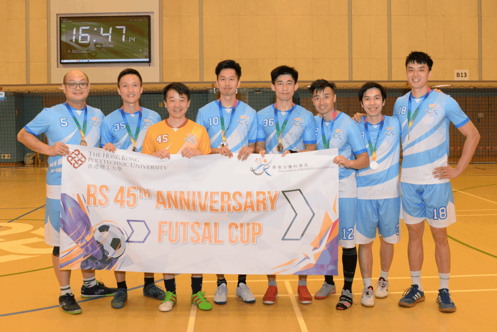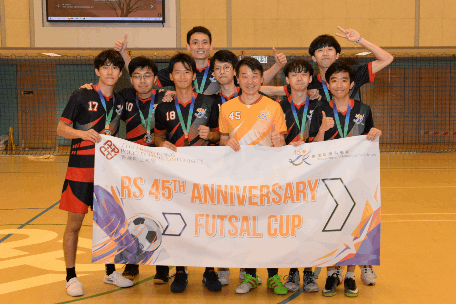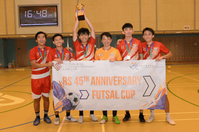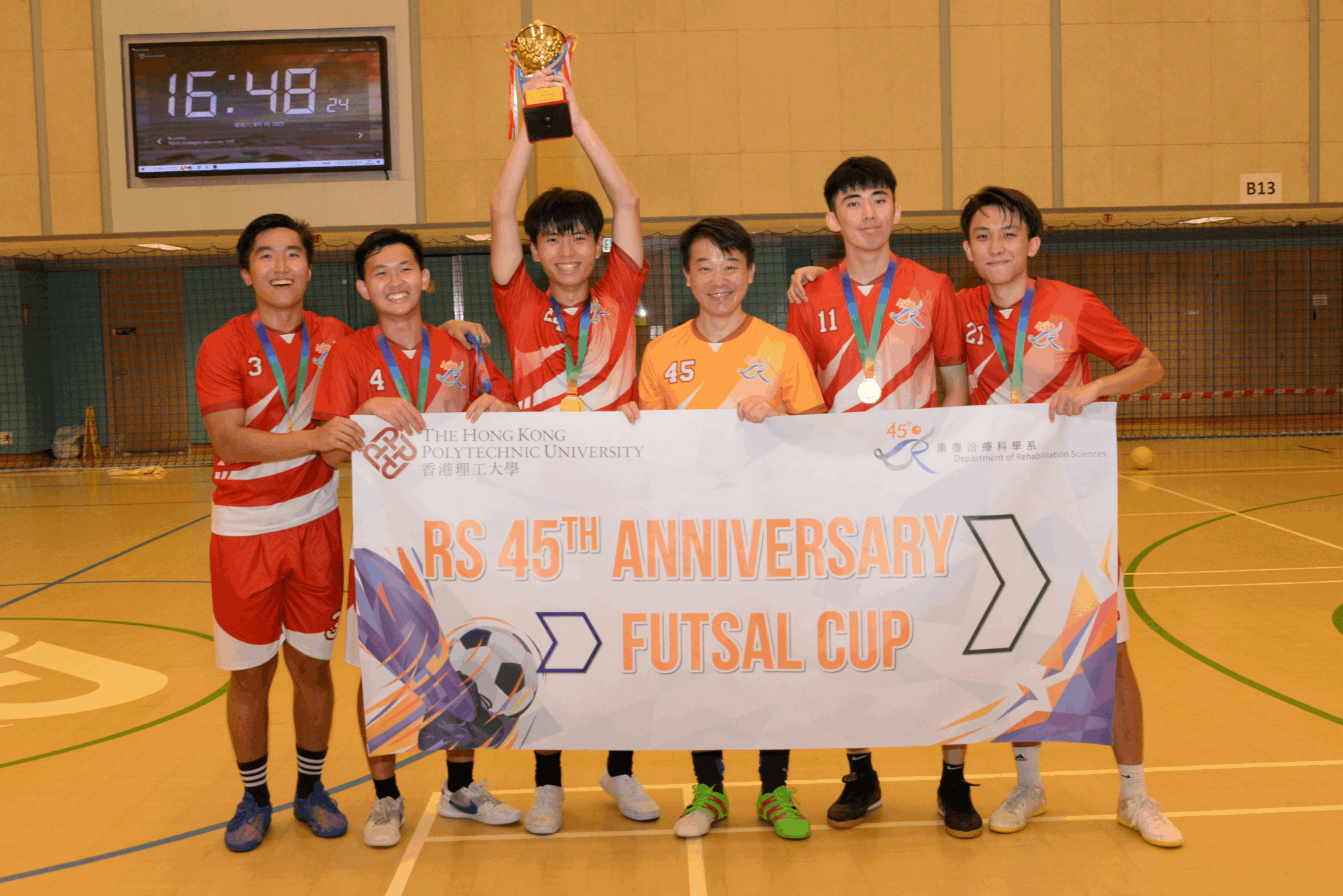 The Department of Rehabilitation Sciences (RS) celebrated its 45th Anniversary with RS Futsal Cup 2023 on 19 August 2023! The event commenced with a ceremonial first pitch, led by Ir Prof. Albert Chan (Dean of Students, Student Affairs Office, PolyU) and Prof. Andy Cheng (Associate Head and Professor, RS, PolyU).
