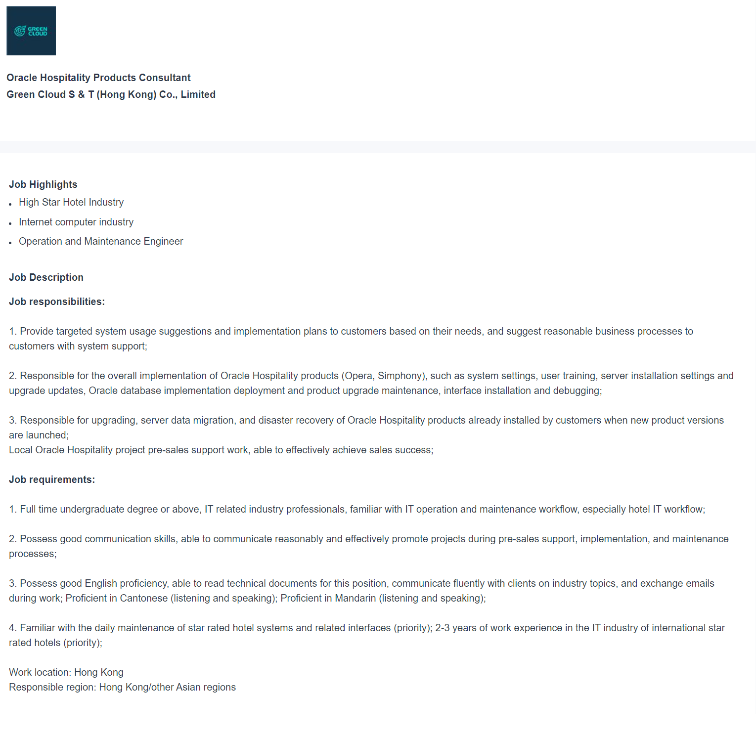 | Green Cloud S & T (Hong Kong) Co., Limited | Oracle Hospitality Products Consultant | Please apply with your CV and send it to Ms Wang liqun.wang@greencloud.com.cn. | N/A |