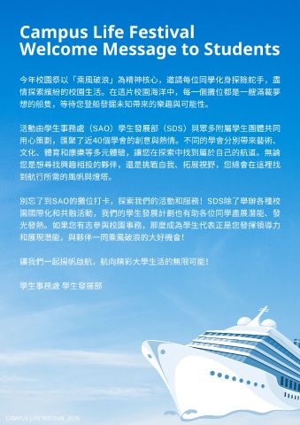 活動由學⽣事務處(SAO)學⽣發展部(SDS)與眾多附屬學⽣團體共同