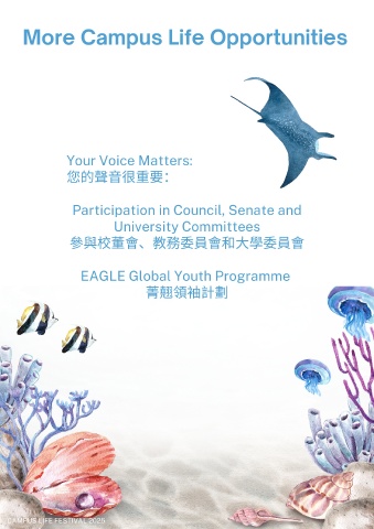 More Campus Life Opportunities Your Voice Matters: 您的聲⾳很重要: Participation in Council, Senate and University Committees 參與校董會、教務委員會和⼤學委員會 EAGLE Global Youth Programme 菁翹領袖計劃 CAMPUS LIFE FESTIVAL 2025 59