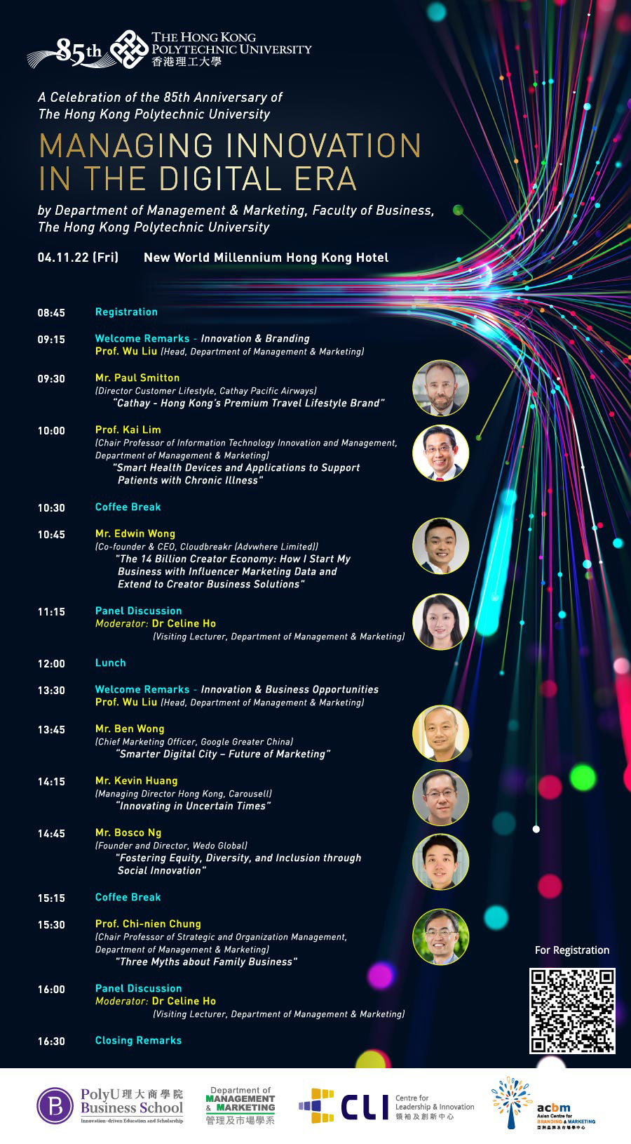 You are cordially invited to join us at our Departmental Conference, titled "Managing Innovation in the Digital Era”, in celebration of the 85th Anniversary of the Hong Kong Polytechnic University, on November 4, 2022 (Fri, 09:15-16:30), in New World Millennium Hong Kong Hotel, Tsim Sha Tsui.