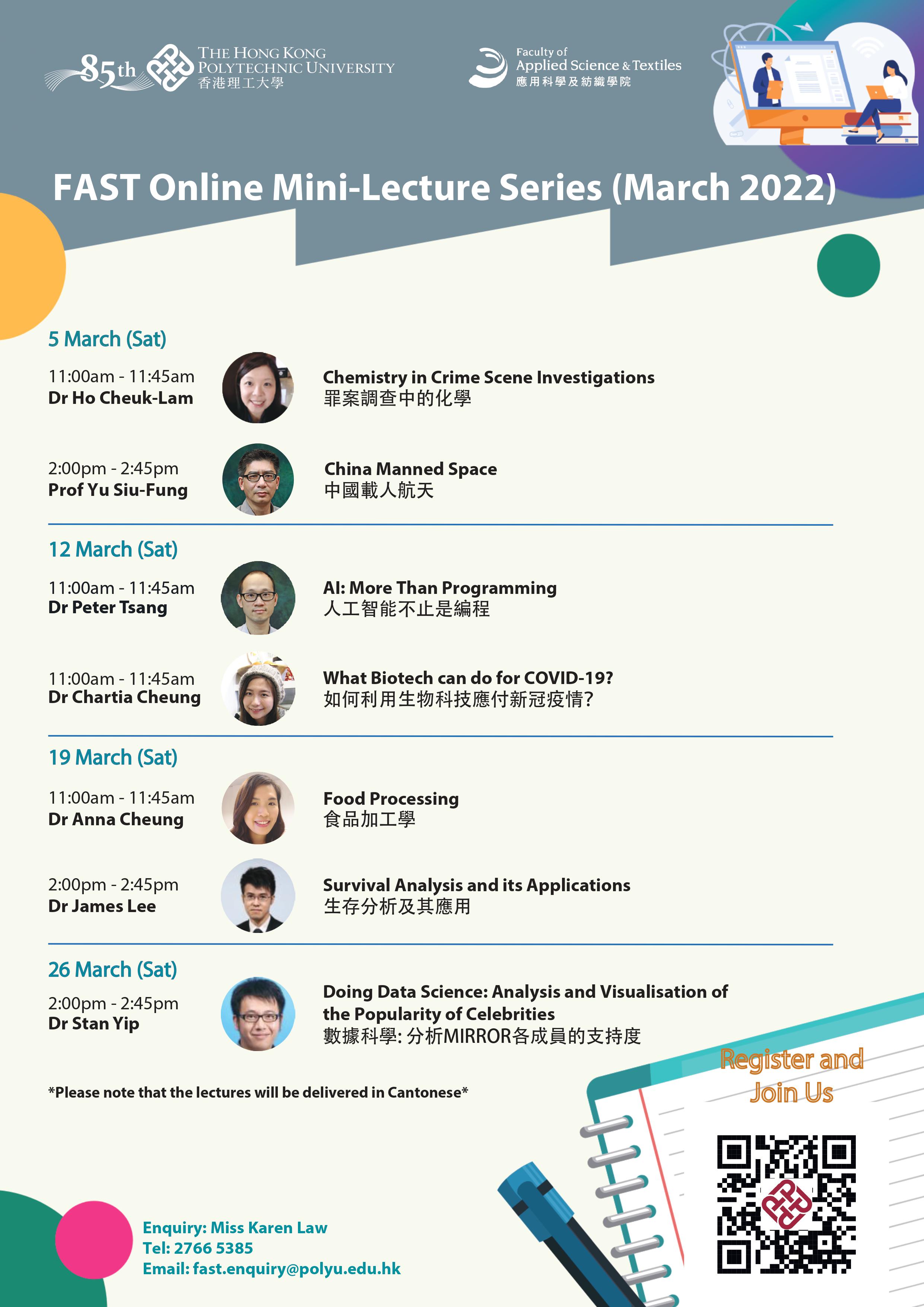 The Faculty of Applied Science and Textiles organized the Mini-lecture Series for more than four years. The lectures aim to enrich students' knowledge in creative perspectives and arouse their interest in Sciences including Biology, Chemistry, Mathematics and Physics. In view of the severe development of the COVID-19 pandemic, the upcoming FAST Mini-Lecture Series will be conducted online every Saturday between 5 and 26 March 2022. We have updated the list of topics in different fields of study, and wish that you could support the series. Interested parties may register for the online lectures via the online registration form at https://polyu.hk/jDLHr.