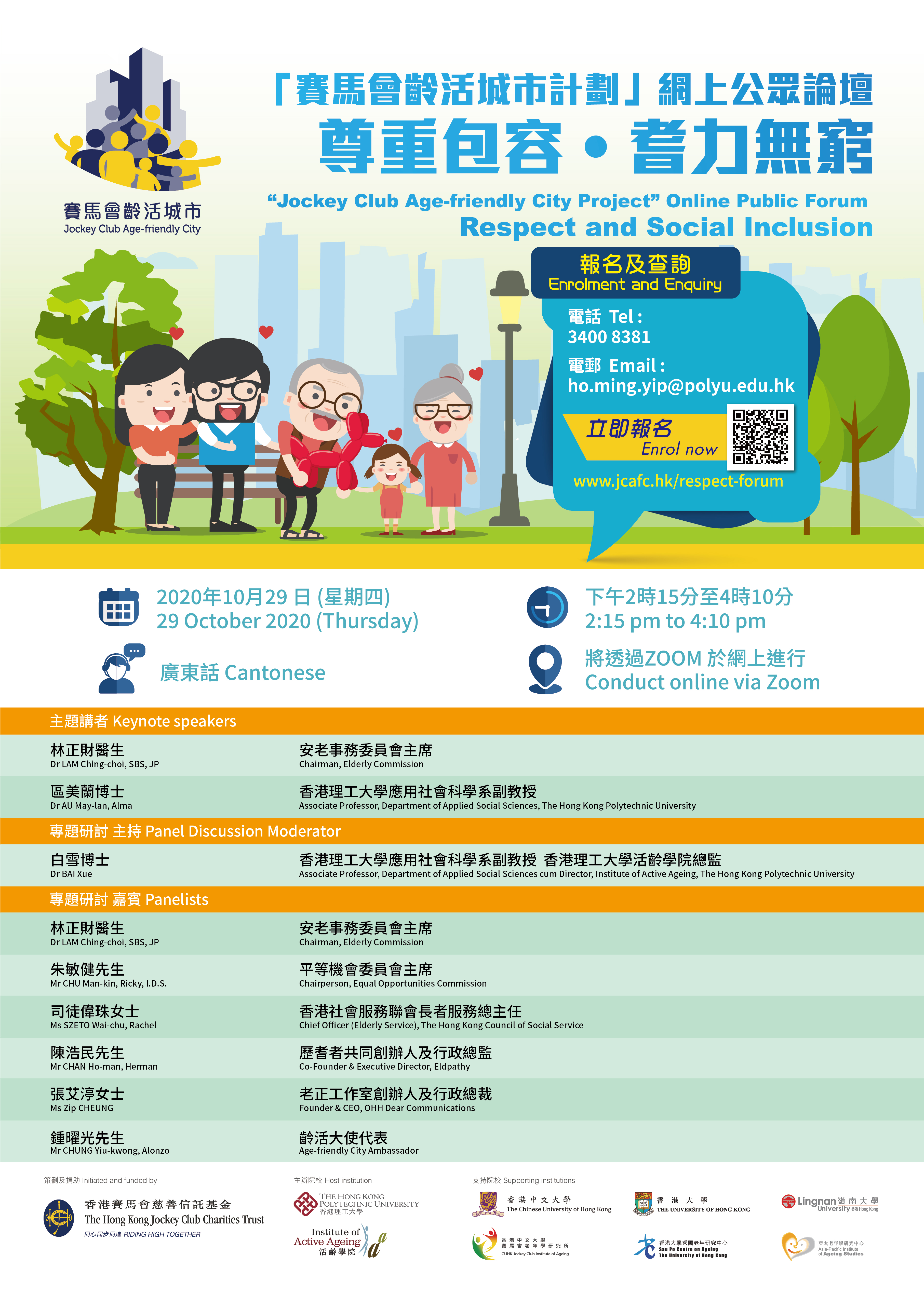 香港理工大学活龄学院将举办以「尊重包容.耆力无穷」为题的网上公众论坛,透过讲者的分享及讨论,让参加者更了解长者的贡献和老龄化社会的需要,并一起探讨如何推广正面的长者形象,从而建立尊重与包容的社会文化。欢迎任何人士参加!