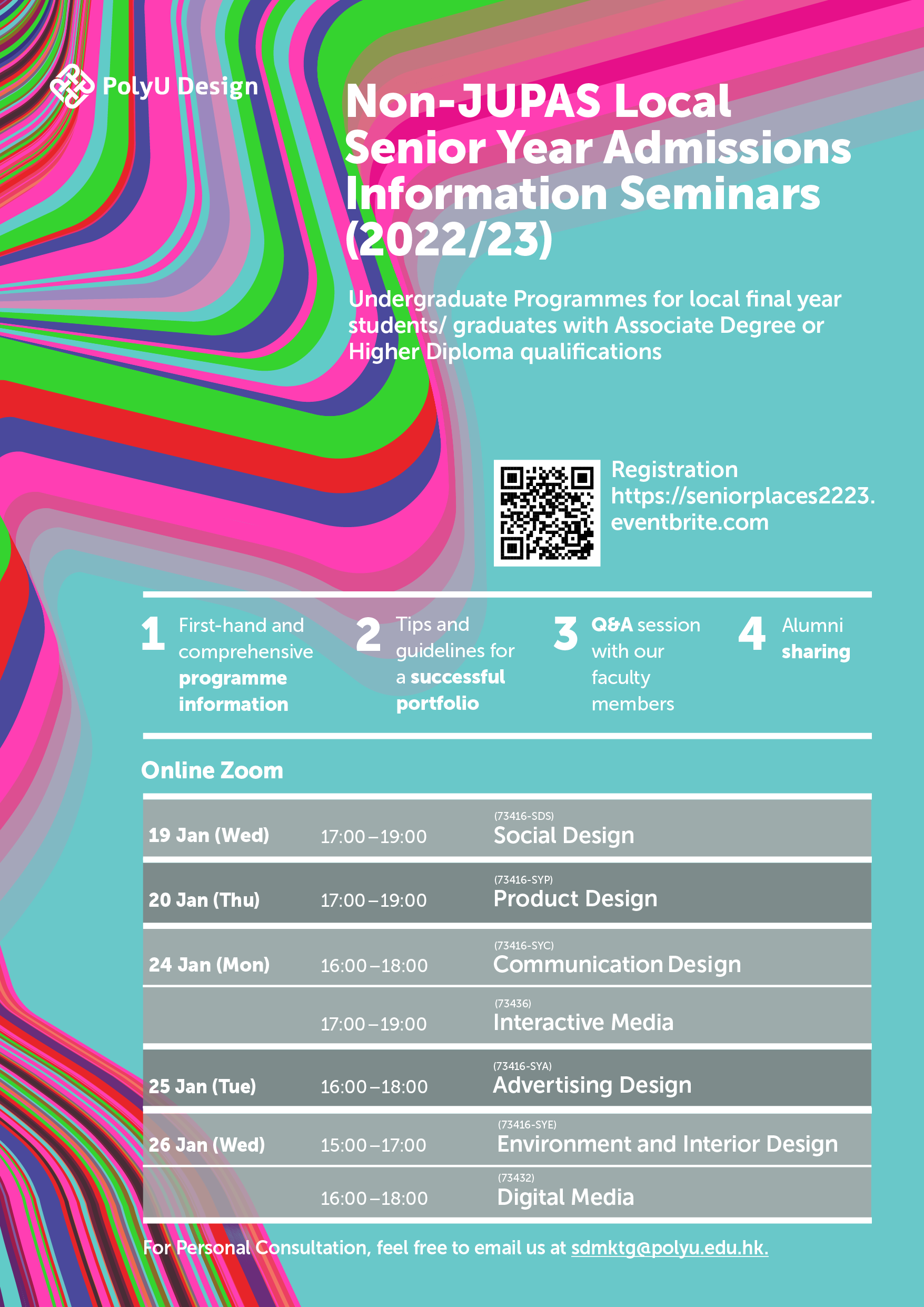 The Hong Kong Polytechnic University School of Design is now inviting students or graduates of Higher Diploma, Associate Degree or other programmes of equivalent qualifications who wish to study in design at the university via the non-JUPAS path to join the Online Information Seminars of our BA(Hons) programmes.