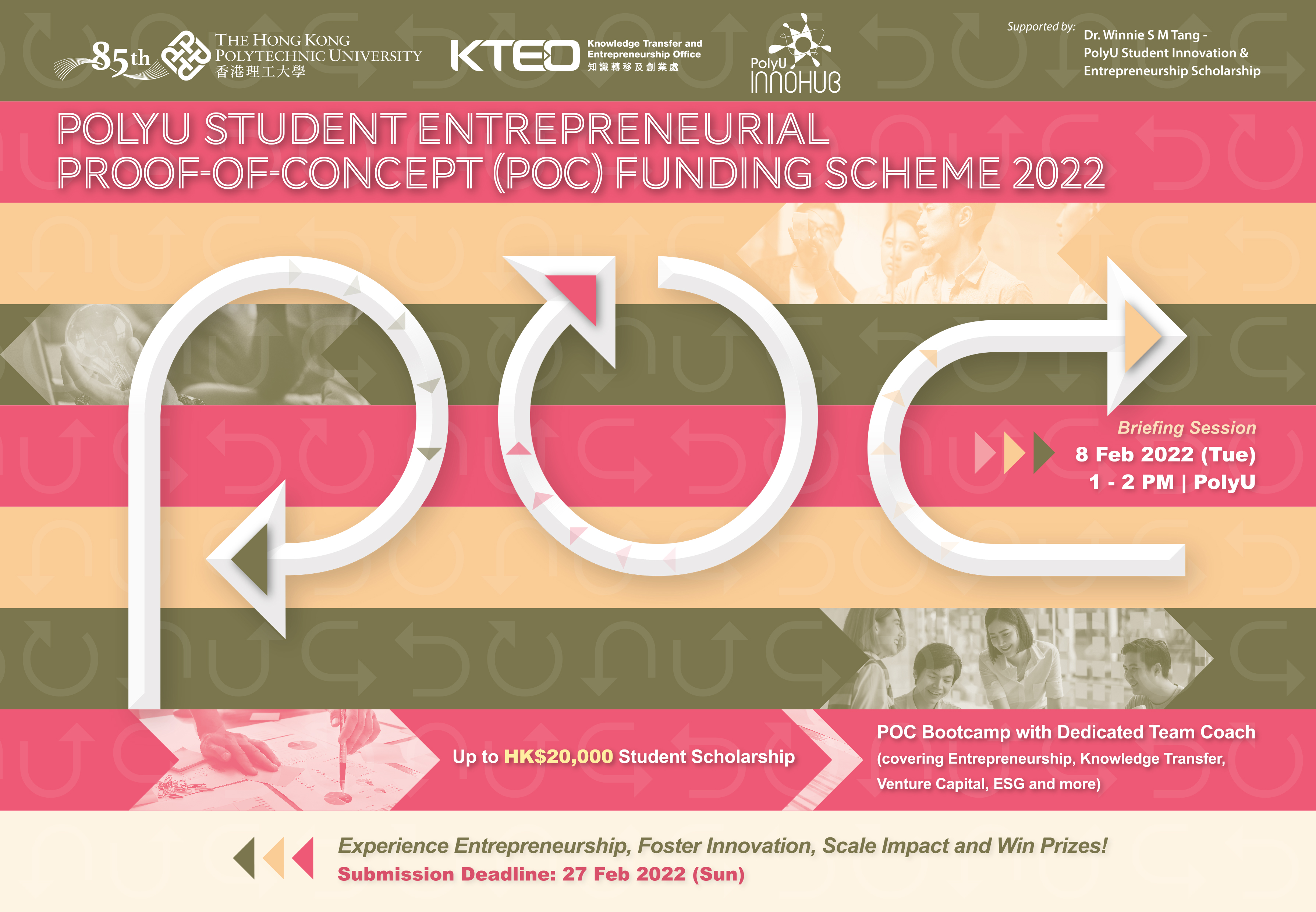 PolyU Student Entrepreneurial Proof-of-Concept (POC) Funding Scheme is a funding initiative launched in 2017 as one of the key entrepreneurship education components at PolyU. As of 2021, over 120 student projects have benefitted from almost HK$1.7 million in funding and other non-financial support. With the kind support from ‘Dr Winnie S M Tang-PolyU Student Innovation & Entrepreneurship Scholarship’ since 2022, POC Fund aims to instil a problem-driven innovation mindset into young talents through experiential learning and student-initiated research and development.