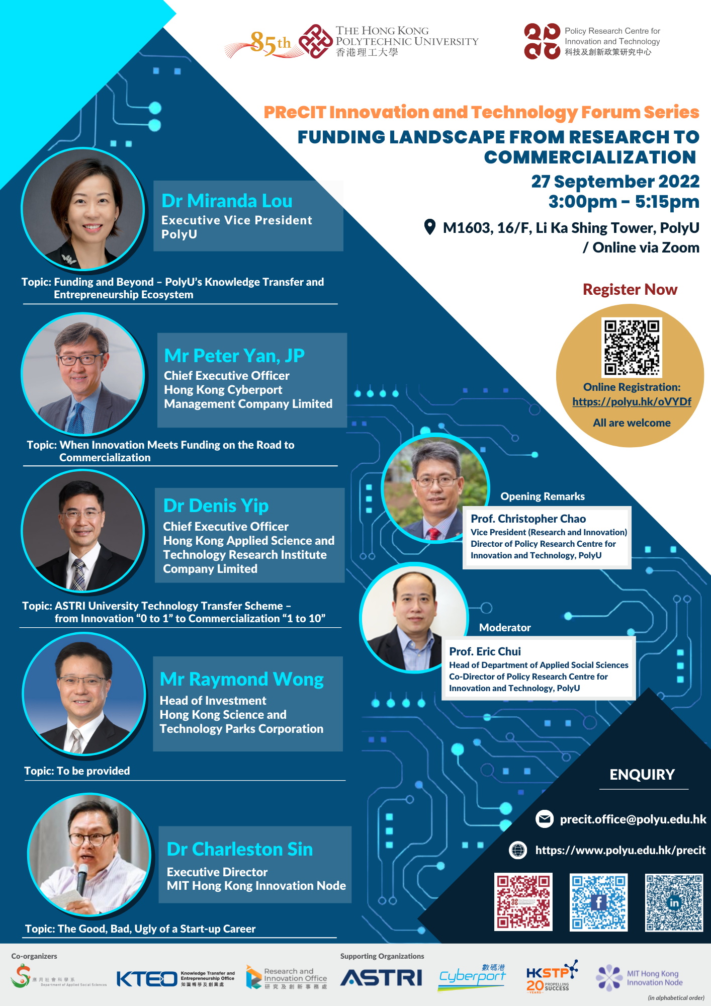 You are cordially invited to join the second forum entitled “Funding Landscape from Research to Commercialization”, co-organized by the Department of Applied Social Sciences (APSS), Knowledge Transfer and Entrepreneurship Office (KTEO) and Research and Innovation Office (RIO). Leaders from Hong Kong leading I&T and research business incubators including HKSTP, Cyberport, ASTRI, MIT Hong Kong Innovation Node and Executive Vice President of PolyU will share their insights on how to snatch I&T talents and commercialize research concepts. Successful startups nurtured by PolyU will contribute their wisdom at the panel discussion session.