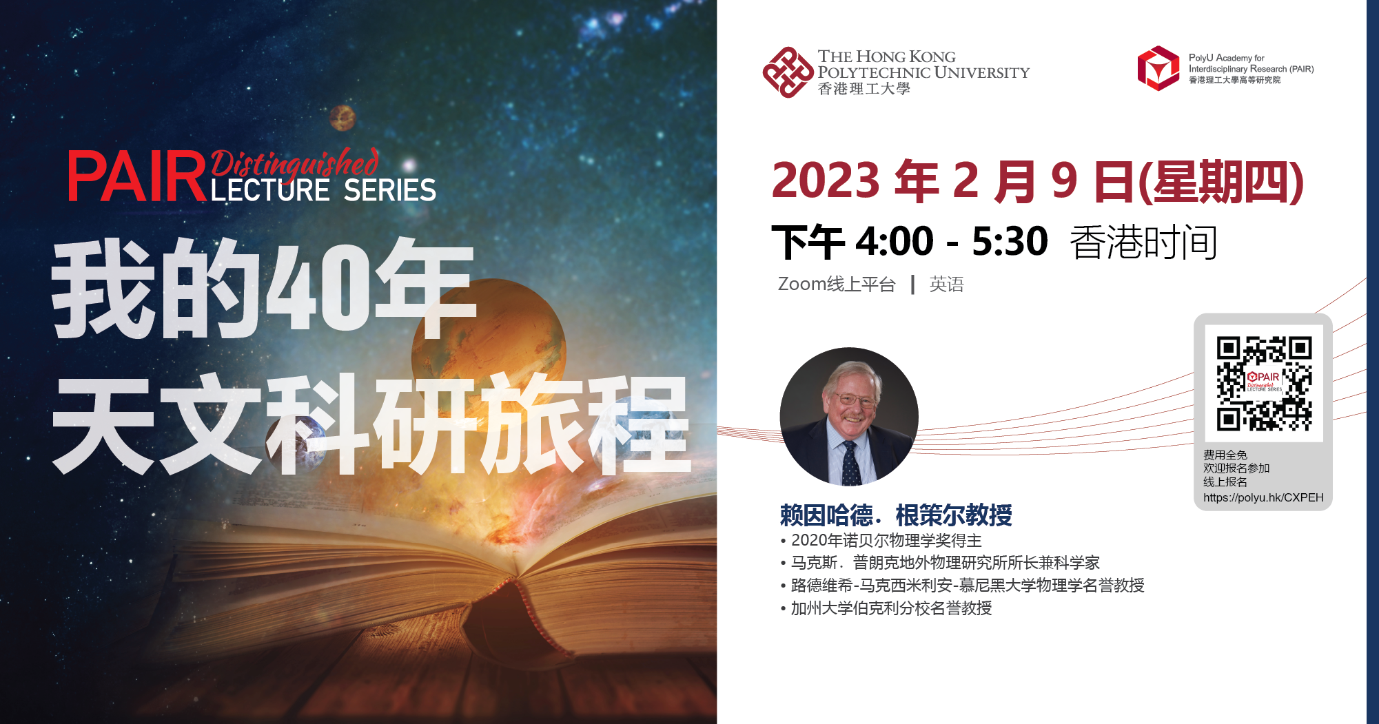 香港理工大学高等研究院诚邀大家参加于二零二三年二月九日(星期四)举行的PAIR杰出讲座。是次讲题为「我的四十年天文科研旅程」,并由2020年诺贝尔物理学奖得主丶马克斯.普朗克地外物理研究所所长兼科学家赖因哈德.根策尔教授主讲。