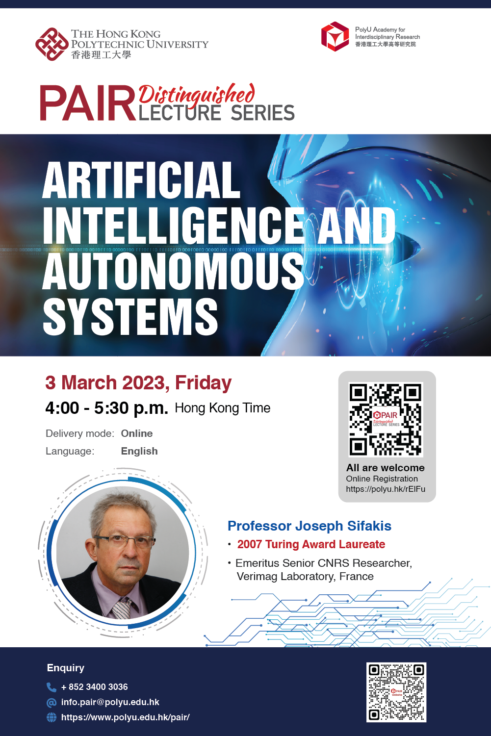圖靈獎得主將於三月三日線上主講PAIR傑出講座 香港理工大學高等研究院誠邀大家參加於二零二三年三月三日(星期五)舉行的PAIR傑出講座。 是次講題為「人工智能與自主系統」,並由2007年圖靈獎得主、法國Verimag實驗室法國國家科學研究中心榮休高級研究員約瑟夫.斯發基斯教授主講。 於本次講座中,斯發基斯教授將討論一些用以比較人類和人工智慧的現有準則標準,並展示了人類科學知識與人工神經網絡知識之間的一些顯著差異。自主是邁向AGI的重要一步。斯發基斯教授將說明自主系統與人類常識推理心智的關鍵性區別,並提出了自主系統應該具備的特徵。他亦將會提出AGI的發展方向和挑戰,其中包括,為系統工程和科學知識奠定新的基礎,以及探討人類智慧蘊藏著的身心現象。 萬勿錯過向傑出學者學習的機會!