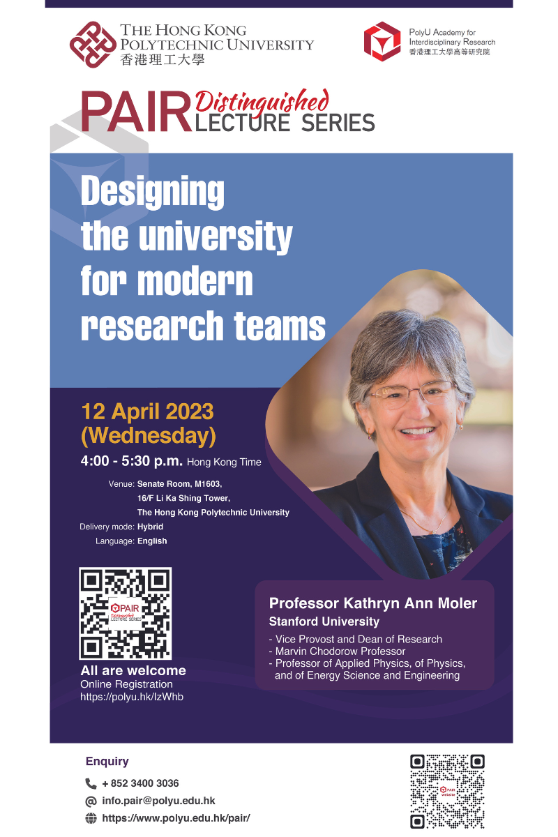 香港理工大学高等研究院诚邀您于 2023 年 4月 12 日(星期三)下午 4:00-5:30(香港时间)在理大校园或透过Zoom参加我们的杰出讲座。 是次讲座由美国史丹福大学副教务长兼研究主管、应用物理学、物理学和能源科学工程教授Kathryn Ann Moler主讲,讲题为「Designing the university for modern research teams」(为高校现代科研缔造有利环境)。