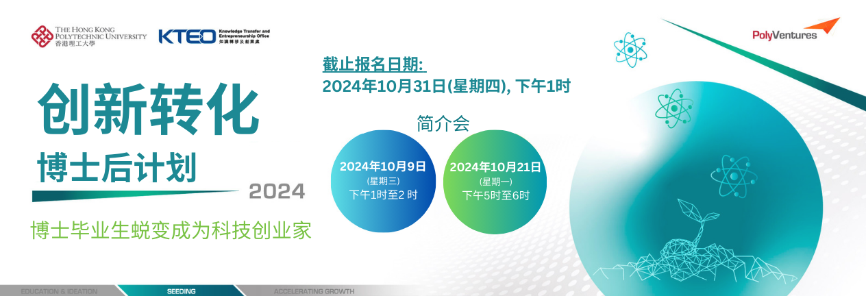 「创新转化博士后计划」旨在培育博士研究生成为科技创业者,将其研究成果转化成对社会具影响力的产品或服务。计划欢迎全球各地对透过创业将研究技术商品化有强烈愿景的博士研究生参加。