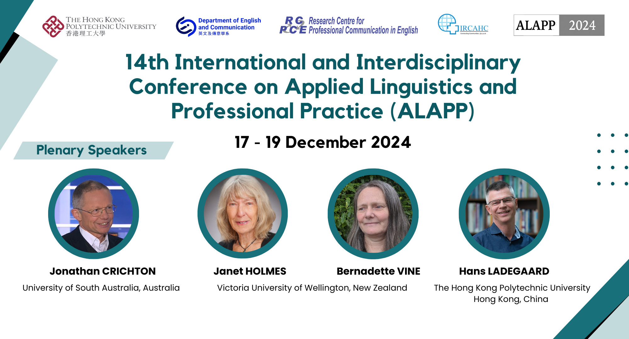 The 14th International and Interdisciplinary Conference on Applied Linguistics and Professional Practice (ALAPP) will be hosted by the Department of English and Communication at The Hong Kong Polytechnic University from 17th – 19th December, 2024.