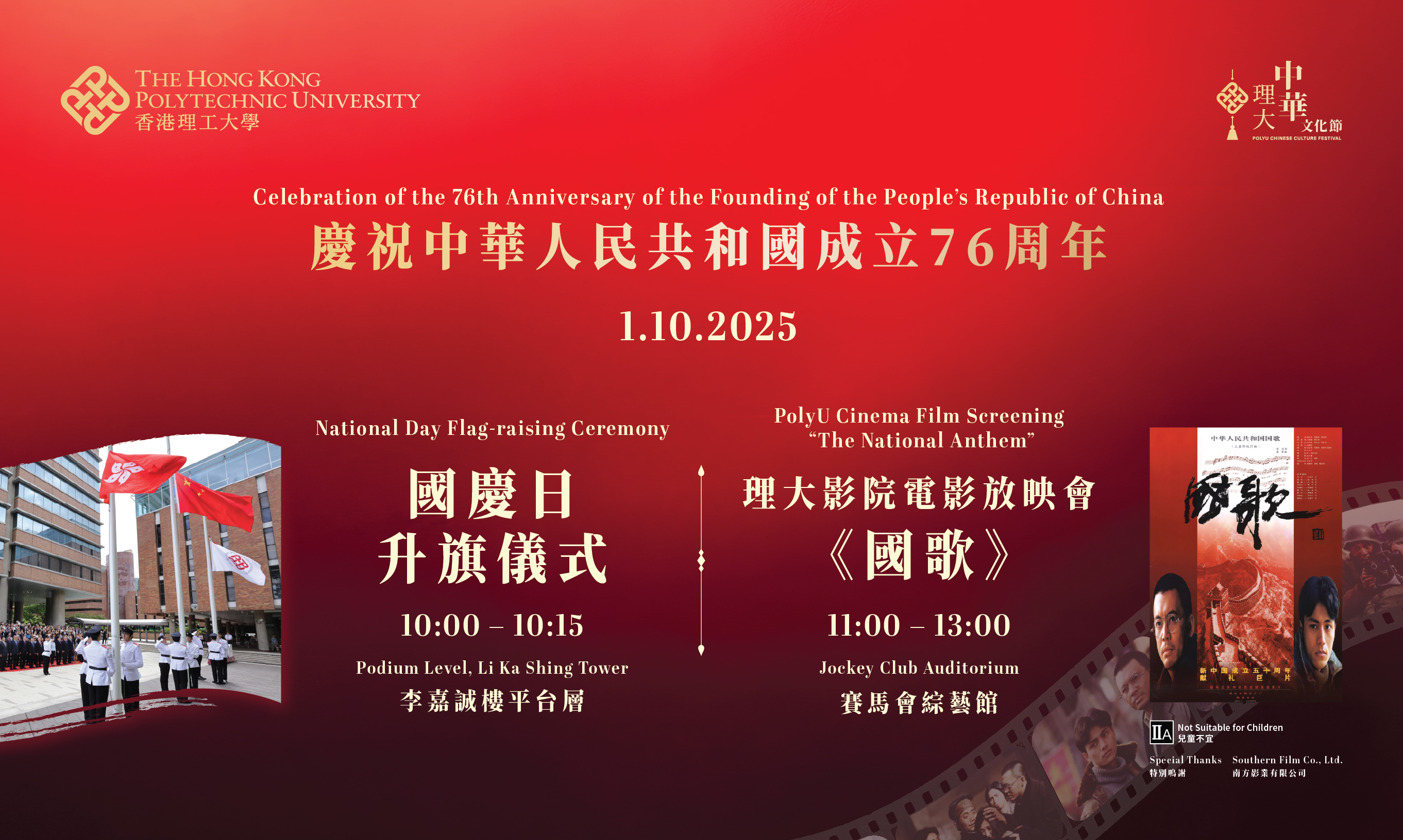 香港理工大学(理大)一直秉承校训「开物成务 励学利民」的精神,致力推动国民教育和弘扬中华文化,提升师生的家国情怀,以及对国家的认同感、自豪感与归属感。为庆祝中华人民共和国成立七十六周年,香港理工大学(理大)将于2025年10月1日举行国庆日升旗仪式。同时为纪念抗战胜利八十周年,升旗仪式后将于赛马会综艺馆放映电影《国歌》。