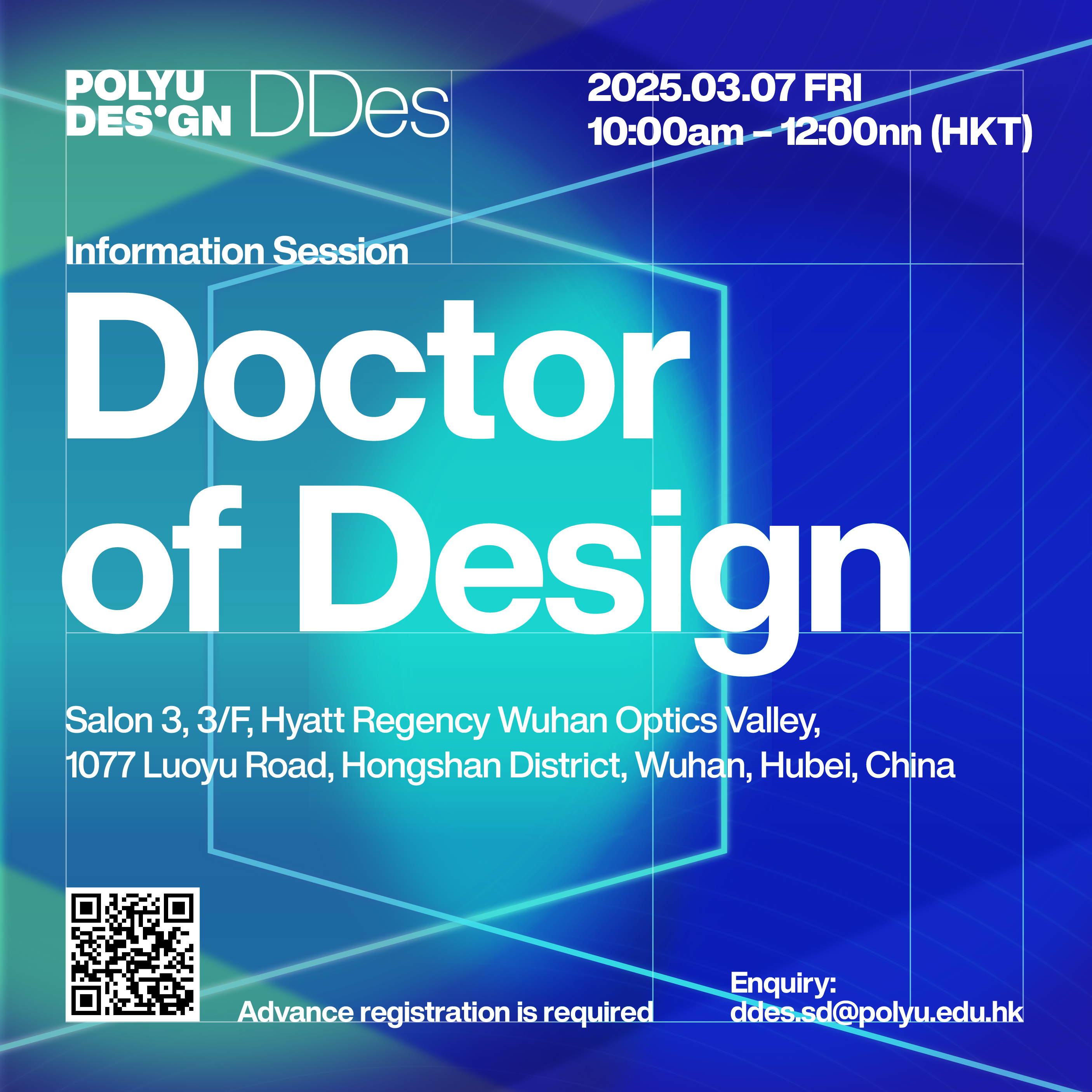 The Doctor of Design (DDes) is designed to cater to the needs of influential industrial leaders, educators, and researchers who are seeking a professional doctorate in design. The DDes represents an alternative path to the achievement of a doctoral qualification. This is a self-financed credit-based programme offered in a mixed mode of study. Subjects are designed to accommodate the learning needs of mature and experienced leaders and educators already holding a master’s degree in relevant disciplines or equivalent qualifications. The DDes programme at the School of Design strives to be the leading professional doctoral programme in Asia, offering training in practice-based research skills and developing interdisciplinary intellectual capability.