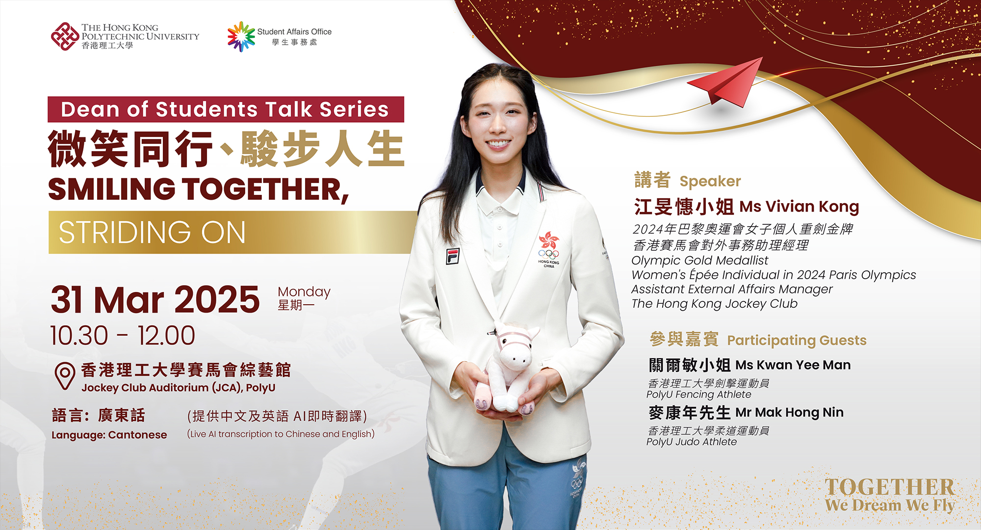 Themed “Together We Dream, We Fly (追夢人生)”, the Dean of Students Talk Series encourages and inspires students to pursue their dreams, achieve their aspirations, and develop their full potential in all aspects of their lives by featuring the stories and the personal journeys of renowned leaders with remarkable accomplishments, including entrepreneurs, industrialists, academic experts, etc., who are invited to pass their nuggets of wisdom on to PolyU students, staff, alumni and friends.