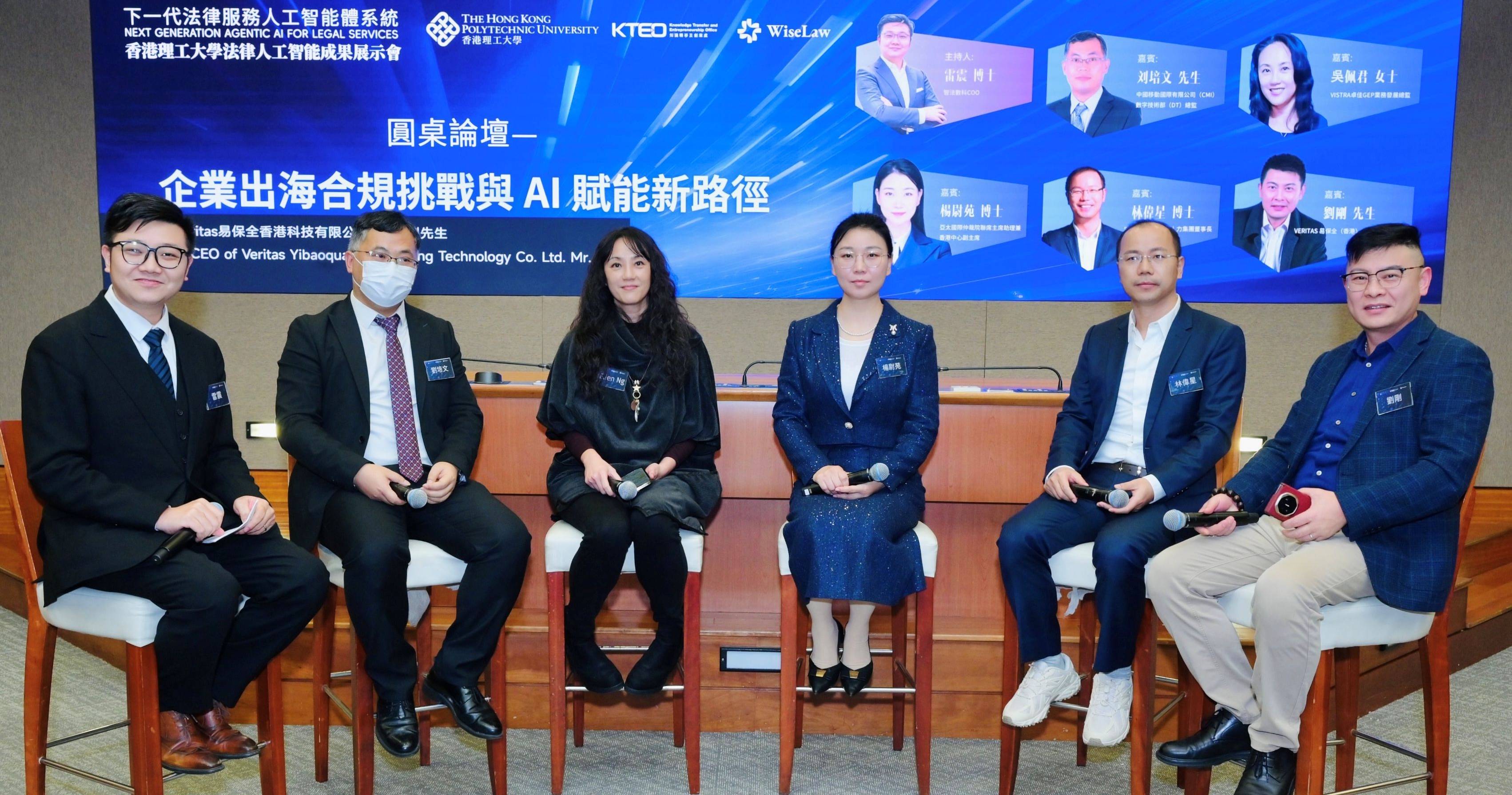 (左起)WiseLaw COO雷震博士、中国移动国际公司数字技术部总监刘培文先生、Vistra卓佳GEP业务发展总监吴佩君女士、亚太国际仲裁院联席主席助理兼香港中心副主席杨尉苑博士、Sailglobal 成功人力集团董事长林伟星博士,以及Veritas 易保全(香港)科技有限公司 CEO 刘刚先生围绕「企业出海合规挑战与AI赋能新路径」议题展开深度讨论。 |