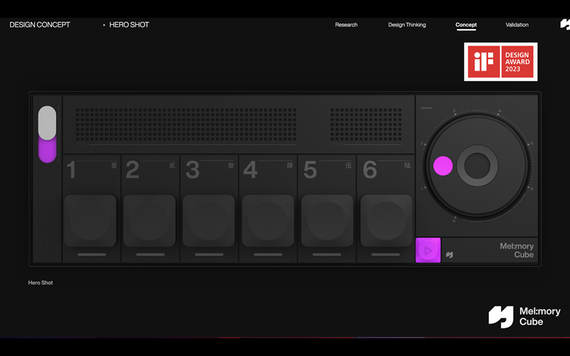 另一項iF及A'Design雙料大獎得主是 「Mel: mory Cube」,由MDes(交互設計)的Xiang Yi和Felix Tsoi設計,並由Prof. Stephen J. Wang指導。該產品旨在提高人們對漢字失憶症的認識,並通過將漢字(視覺感官)轉化為由自我識別機制產生的獨特旋律(聽覺驅動),以多感官和寓教於樂的方式進一步提醒、重建和增強人們對漢字的興趣和記憶發展。