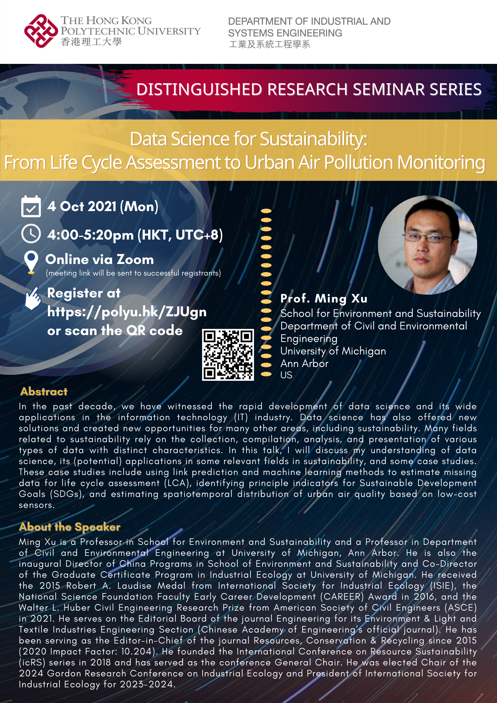 Distinguished Research Seminar Series - "Data Science for Sustainability: From Life Cycle Assessment to Urban Air Pollution Monitoring"