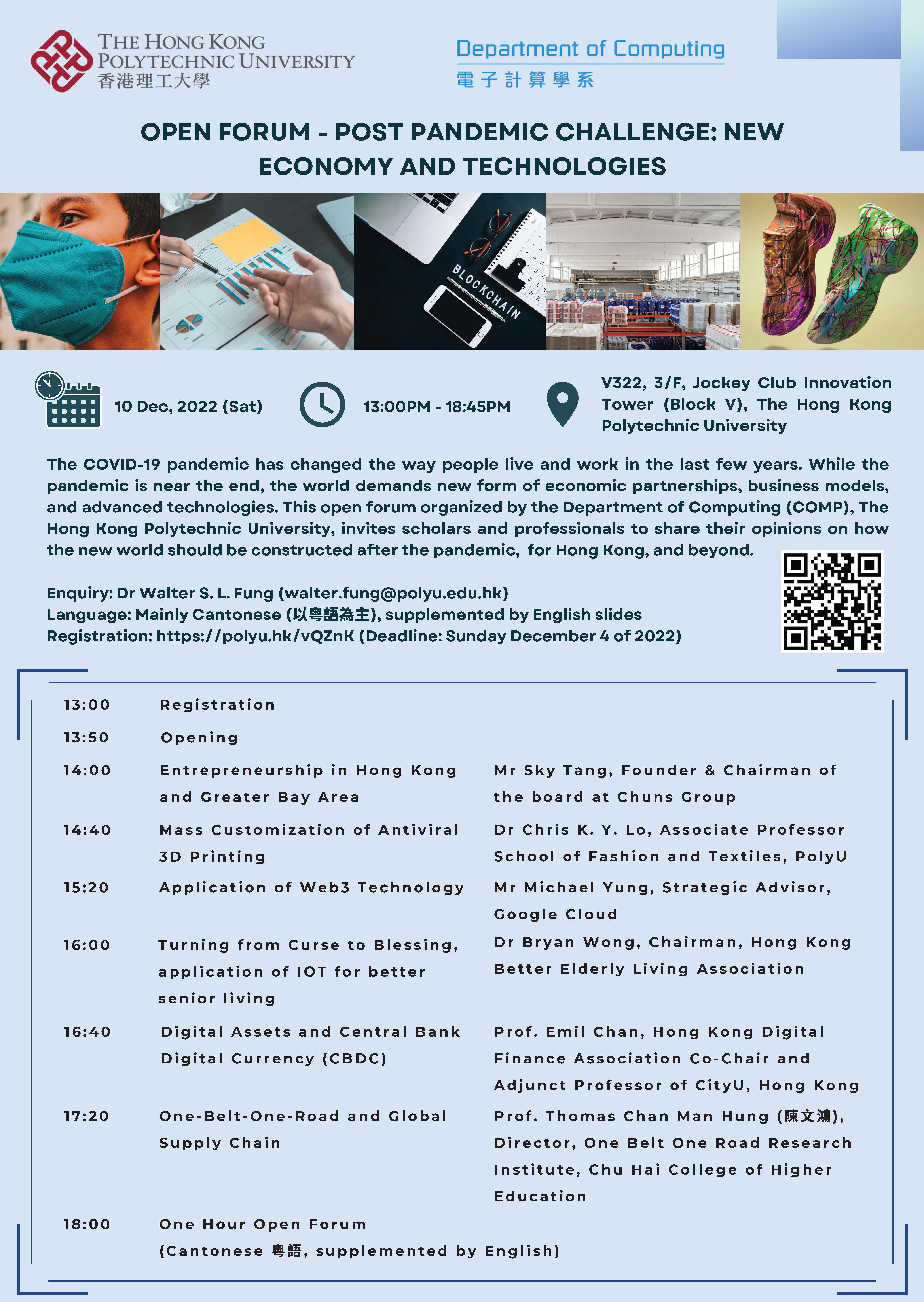 The COVID-19 pandemic has changed the way people live and work in the last few years. While we see light at the end of the pandemic tunnel, the world demands new form of economic partnerships, business models, and advanced technologies. Organised by the Department of Computing (COMP) of the Hong Kong Polytechnic University, this open forum invites scholars and professionals to share their opinions on how the new world should be constructed after the pandemic, for Hong Kong, and beyond.