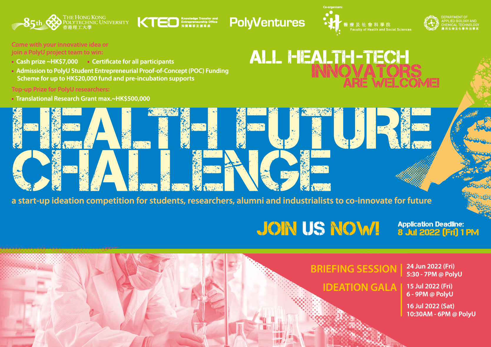 Health Future Challenge is a start-up ideation competition for students, researchers, alumni and industrialists to team up and come up with health-tech ideas and business model for the future. The competition aims to: