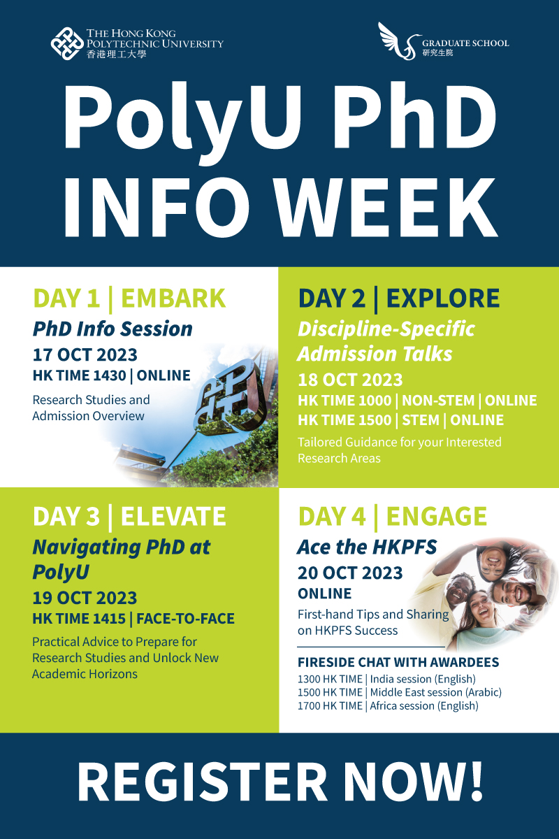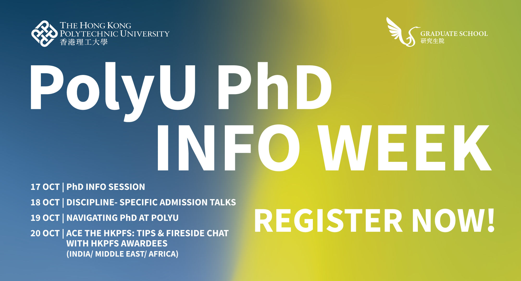 資訊週專為有意進修研究生課程的同學而設。活動將涵蓋與理大研究型博士及碩士課程相關的各種主題﹑理大的研究優勢﹑以及香港博士研究生獎學金計劃(HKPFS)的申請攻略等。