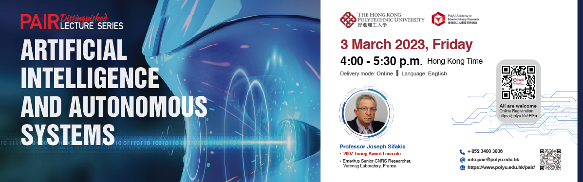 香港理工大學高等研究院誠邀大家參加於二零二三年三月三日(星期五)舉行的PAIR傑出講座。 是次講題為「人工智能與自主系統」,並由2007年圖靈獎得主、法國Verimag實驗室法國國家科學研究中心榮休高級研究員約瑟夫.斯發基斯教授主講。
