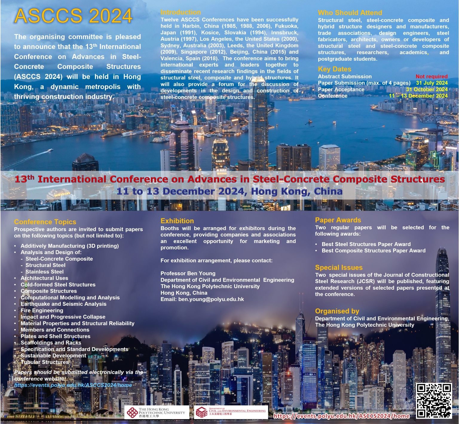 The conference aims to bring international experts and leaders together to disseminate recent research findings in the fields of structural steel, composite and hybrid structures. It will also provide a forum for the discussion of developments in the design and construction of steel-concrete composite structures. This conference will be of interest to structural steel, steel-concrete composite and hybrid structure designers and manufacturers, trade associations, design engineers, steel fabricators, architects, owners or developers of structural steel and steel-concrete composite structures, researchers, academics, and postgraduate students.