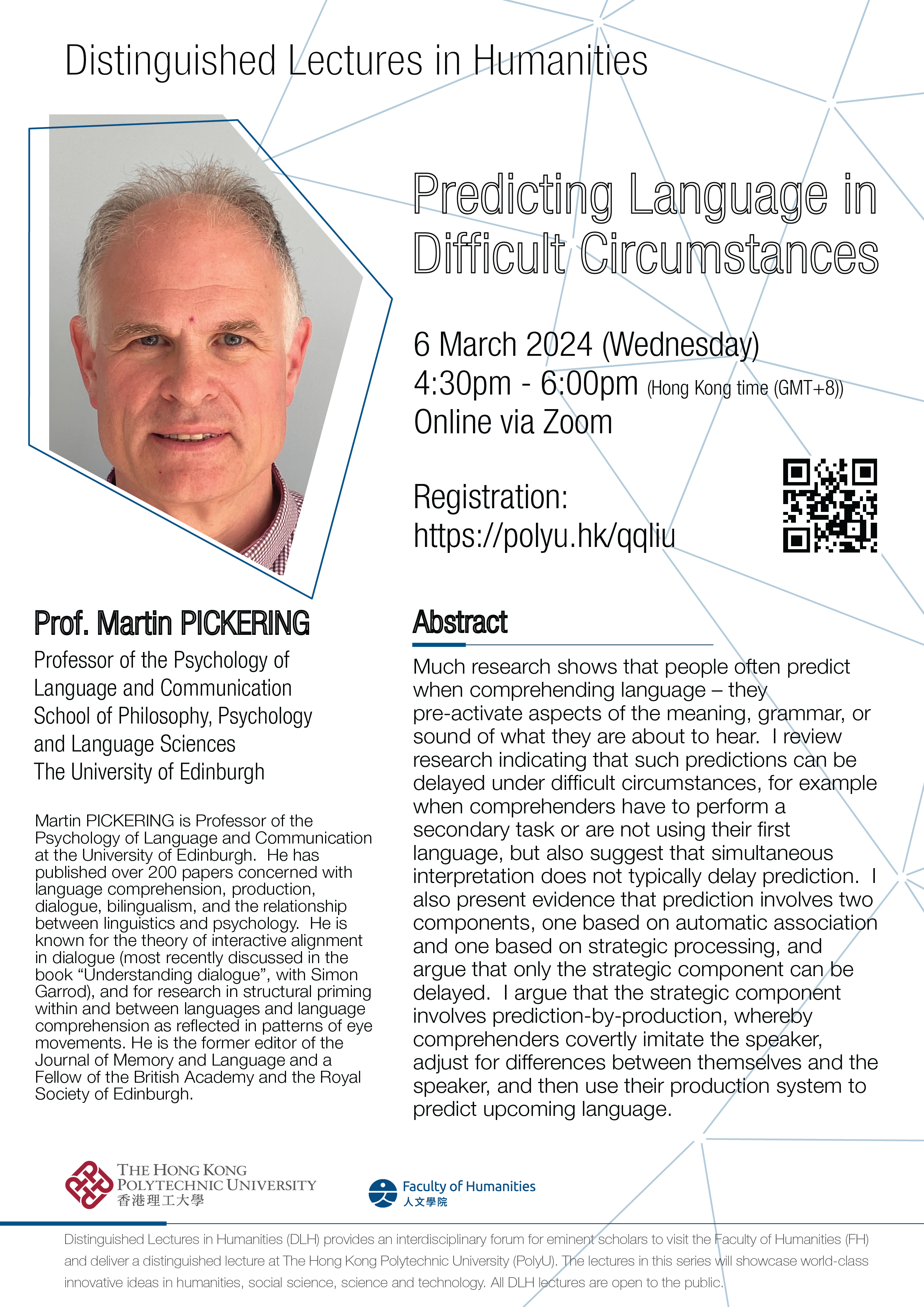 Martin PICKERING is Professor of the Psychology of Language and Communication at the University of Edinburgh. He has published over 200 papers concerned with language comprehension, production, dialogue, bilingualism, and the relationship between linguistics and psychology. He is known for the theory of interactive alignment in dialogue (most recently discussed in the book “Understanding dialogue”, with Simon Garrod), and for research in structural priming within and between languages and language comprehension as reflected in patterns of eye movements. He is the former editor of the Journal of Memory and Language and a Fellow of the British Academy and the Royal Society of Edinburgh.