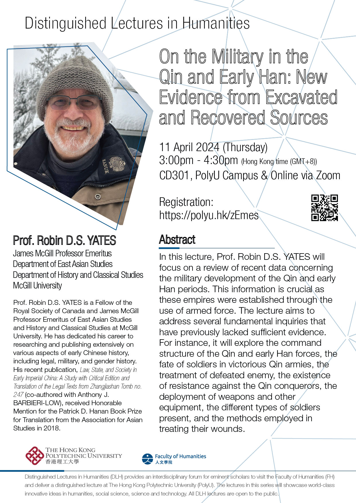 In this lecture, Prof. Robin D.S. YATES will focus on a review of recent data concerning the military development of the Qin and early Han periods. This information is crucial as these empires were established through the use of armed force. The lecture aims to address several fundamental inquiries that have previously lacked sufficient evidence. For instance, it will explore the command structure of the Qin and early Han forces, the fate of soldiers in victorious Qin armies, the treatment of defeated enemy, the existence of resistance against the Qin conquerors, the deployment of weapons and other equipment, the different types of soldiers present, and the methods employed in treating their wounds.