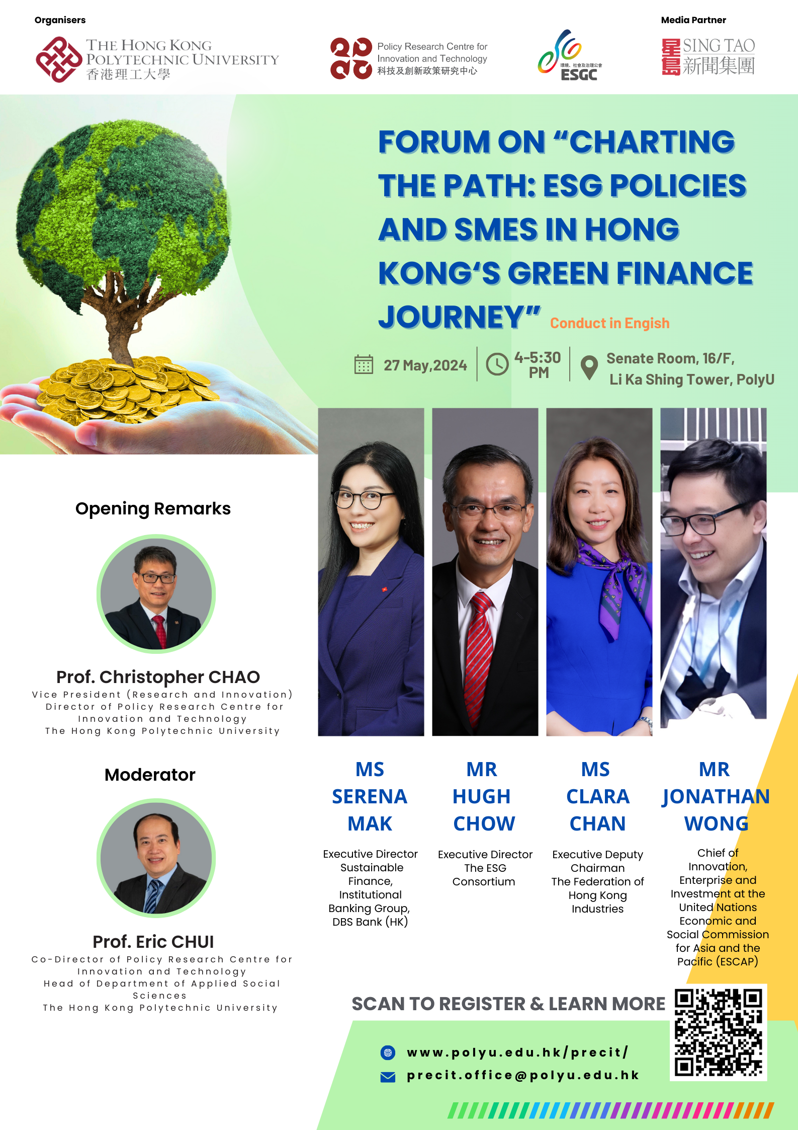 Hong Kong is on a mission to become an international green finance center, and the HKSAR government's visionary statement on developing a sustainability disclosure ecosystem is paving the way for transformative change. With this in mind, You are cordially invited to attend the forum on "Charting the Path: ESG Policies and SMEs in Hong Kong's Green Finance Journey" co-organised by the Policy Research Centre for Innovation and Technology, and The ESG Consortium,to share your perspectives on navigating the evolving regulatory landscape requirements whilst unveiling opportunities.