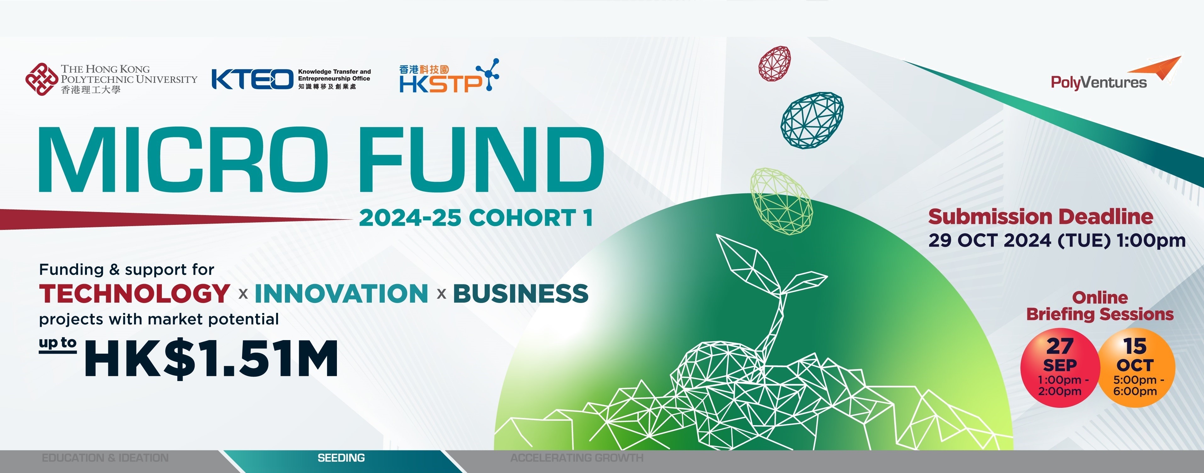 - This briefing session will be recorded for the purpose of keeping internal record and the recording may be made available to the Knowledge Transfer and Entrepreneurship Office (KTEO) of The Hong Kong Polytechnic University only. The recorded images will be handled by KTEO according to the prevailing policy of The Hong Kong Polytechnic University. Enquiries shall be addressed to Micro Fund by email at micro.fund@polyu.edu.hk.